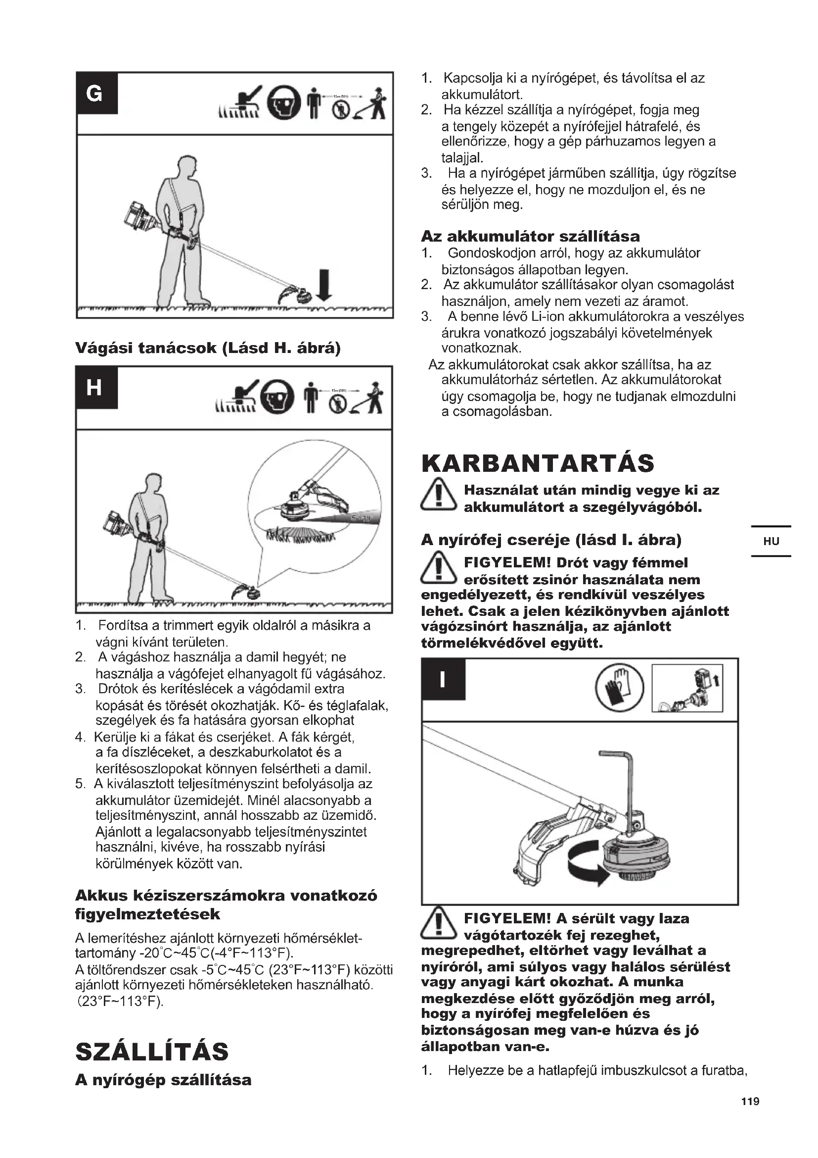 a tengely közepét a nyírófejjel hátrafelé, és HOOHQĘUL]]HKRJ\DJpSSiUKX]DPRVOHJ\HQD talajjal. +DDQ\tUyJpSHWMiUPĦEHQV]iOOtWMD~J\U|J]tWVH pVKHO\H]]HHOKRJ\QHPR]GXOMRQHOpVQH sérüljön meg. $]DNNXPXOiWRUV]iOOtWiVD *RQGRVNRGMRQDUUyOKRJ\D]DNNXPXOiWRU biztonságos állapotban legyen.