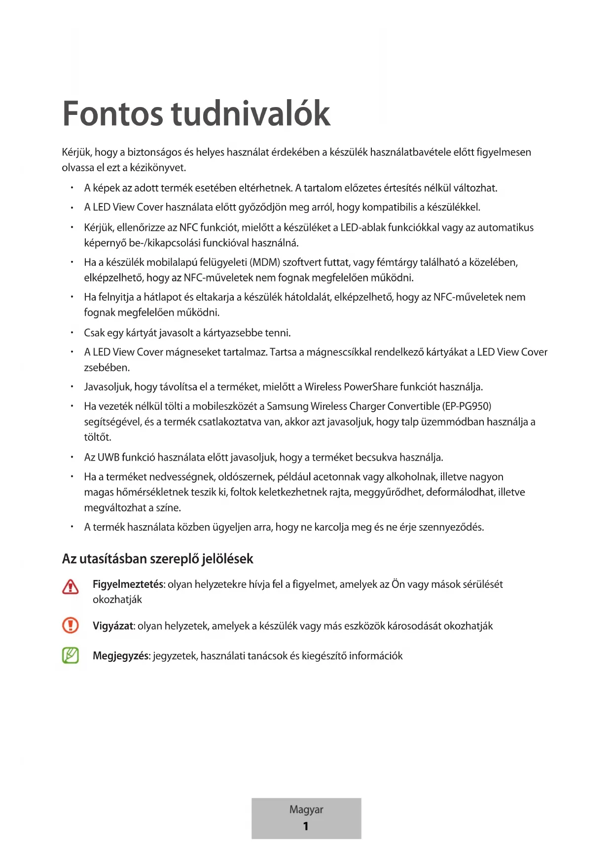A termék használata közben ügyeljen arra, hogy ne karcolja meg és ne érje szennyeződés. Az utasításban szereplő jelölések Figyelmeztetés: olyan helyzetekre hívja fel a figyelmet, amelyek az Ön vagy mások sérülését okozhatják Vigyázat: olyan helyzetek, amelyek a készülék vagy más eszközök károsodását okozhatják Megjegyzés: jegyzetek, használati tanácsok és kiegészítő információk Magyar
