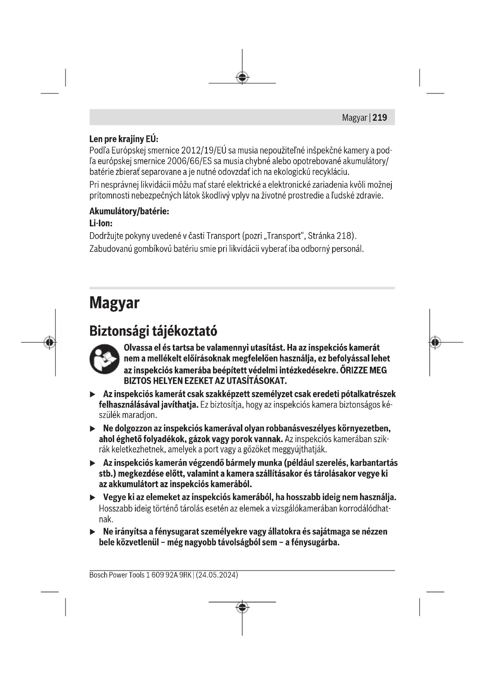 - <Kikapcsolás… elteltével>: Kiválaszthatja az időtartamot, amely után a vizsgáló- kamera automatikusan kikapcsol, ha nem kerül semmilyen gomb megnyomásra. – <Készülék infó>: Itt a készülékkel kapcsolatos információk, például a telepített szoft- ververzió és jogi információk találhatók. – <Gyári beáll. visszaáll.>: Itt valamennyi menüopciót vissza lehet állítani a gyári beál- lításra. Ezzel egyidejűleg valamennyi tárolt fájl véglegesen törlésre kerül. 1 609 92A 9RK | (24.05.2024) Bosch Power ToolsMagyar | 229 Felvételek mentése/átvitele Fénykép készítése Fénykép készítéséhez az aktuális kijelzőről nyomja meg a Fénykép készítése gombot(12). A fényképek a vizsgálókamera belső memóriájában kerülnek tárolásra és USBType‑C® interfészen keresztül vihetők át. Adatátvitel az USBType-C® interfészen át Az USBType‑C® interfészen át történő adatátvitelhez kapcsolja be a vizsgálókamerát. Nyissa fel az USBType‑C® csatlakozóhüvely(17)fedelét. Kapcsolja össze az USBType‑C® csatlakozóhüvelyét az USBType‑C® kábel segítségével(18) a számítógé- pével. Nyissa meg a számítógépén a fájlböngészőt, és jelölje ki a meghajtótBosch_GIC. A vizs- gálókamerában tárolt fájlok a mérőműszer belső memóriájából átmásolhatók, áthelyez- hetők a számítógépére vagy törölhetők. Mihelyt befejezte a kívánt eljárást, válassza le a meghajtót. Megjegyzés: Először mindig válassza le a számítógép operációs rendszerében a meghaj- tót (meghajtó kiadása), mivel ellenkező esetben a mérőműszer belső memóriája megsé- rülhet. Távolítsa el az USBType-C® kábelt (a vizsgálókamera ekkor automatikusan kikapcsol). Zárja le a felső fedelet(16) a por és fröccsenő víz elleni védelem érdekében. Megjegyzés: Az USB Type-C® interfészen keresztül kizárólag PC-hez csatlakoztassa a vizsgálókamerát. Más készülékekhez való csatlakoztatás esetén a vizsgálókamera meg- rongálódhat. Megjegyzés: Az USB Type-C® interfész kizárólag adatátvitelre szolgál, akkumulátorokat vagy más készülékeket nem lehet ezen az interfészen át feltölteni. Munkavégzési tanácsok Vizsgálja meg a környezetet, amelyet a kamerával át akar vizsgálni és különösen ügyeljen az akadályokra és a veszélyes pontokra. Hajlítsa úgy meg a(1)kamerakábelt, hogy a kamerafejet jól be lehessen vezetni az átvizs- gálásra kerülő környezetbe. Óvatosan vezesse be a kamerakábelt. Állítsa be úgy a(3)kameralámpa fényerejét, hogy a kép jól felismerhető legyen. Erősen fényvisszaverő tárgyak esetén például alacsonyabb megvilágítással vagy fekete-fehér kontraszttal jobb minőségű képet lehet létrehozni. Ha a vizsgálatra kerülő tárgyak életlenül jelennek meg, csökkentse vagy növelje a(2)kamerafej és a tárgy közötti távolságot. Bosch Power Tools 1 609 92A 9RK | (24.05.2024)230 | Magyar Hibák – okaik és elhárításuk módja Hiba kijelzése a kijelzőn A hiba oka Hibaelhárítás (sárga figyel- meztetés) Belső memória majd- nem megtelt Töröljön fájlokat a belső memóriáról. (piros figyelmez- tetés) Belső memória meg- telt Töröljön fájlokat a belső memóriáról. Hiba a belső memóri- ában Indítsa újra a vizsgálókamerát. Ha továbbra is fennáll a probléma, forduljon egy hivatalosBosch vevőszolgálathoz. Karbantartás és szerviz Karbantartás és tisztítás Ne merítse bele a(13)kézi vezérlőkészüléket vízbe vagy más folyadékokba. Tartsa mindig tisztán az inspekciós kamerát. Ha egészségkárosító hatású anyagokat tar- talmazó területen dolgozott, különösen alaposan tisztítsa meg az inspekciós kamerát és valamennyi segédeszközt. A szennyeződéseket egy nedves, puha kendővel törölje le. Tisztító- vagy oldószereket ne használjon. Mindenek előtt rendszeresen tisztítsa meg a(4)kameralencsét és ügyeljen a bolyhokra. A beépített gombelem kicserélése A gombelem cseréjét a Boschnak vagy egy hivatalos, Bosch elektromos kéziszerszámok- kal foglalkozó vevőszolgálatnak kell elvégeznie. u Figyelem: Egy gombelemet mindig csak egy azonos típusú gombelemre szabad kicserélni. Robbanásveszély áll fenn. u A kimerült gombelemeket az előírásoknak megfelelően kell eltávolítani és ártal- matlanítani. A kimerült gombelemek tömítetlenné válhatnak és így a terméket meg- rongálhatják vagy személyi sérüléseket okozhatnak. 1 609 92A 9RK | (24.05.2024) Bosch Power ToolsMagyar | 231 Vevőszolgálat és alkalmazási tanácsadás A vevőszolgálat a terméke javításával és karbantartásával, valamint a pótalkatrészekkel kapcsolatos kérdésekre szívesen válaszol. A pótalkatrészekkel kapcsolatos robbantott ábrák és egyéb információk a következő címen találhatók: www.bosch-pt.com A Bosch Alkalmazási Tanácsadó Team a termékeinkkel és azok tartozékaival kapcsolatos kérdésekben szívesen nyújt segítséget. Ha kérdései vannak vagy pótalkatrészeket szeretne rendelni, okvetlenül adja meg a ter- mék típustábláján található 10‑jegyű cikkszámot. Magyarország Robert Bosch Kft. 1103 Budapest Gyömrői út. 120. A www.bosch-pt.hu oldalon online megrendelheti készülékének javítását. Tel.:+3618798502 Fax: +3618798505 info.bsc@hu.bosch.com www.bosch-pt.hu További szerviz-címek itt találhatók: www.bosch-pt.com/serviceaddresses Szállítás A javasolt lítium-ion akkumulátorokra a veszélyes árukra vonatkozó követelmények érvé- nyesek. A felhasználók az akkumulátorokat a közúti szállításban minden további nélkül szállíthatják. Ha az akkumulátorok szállításával harmadik személyt (például: légi vagy egyéb szállító vállalatot) bíznak meg, akkor figyelembe kell venni a csomagolásra és a megjelölésre vo- natkozó különleges követelményeket. Ebben az ese