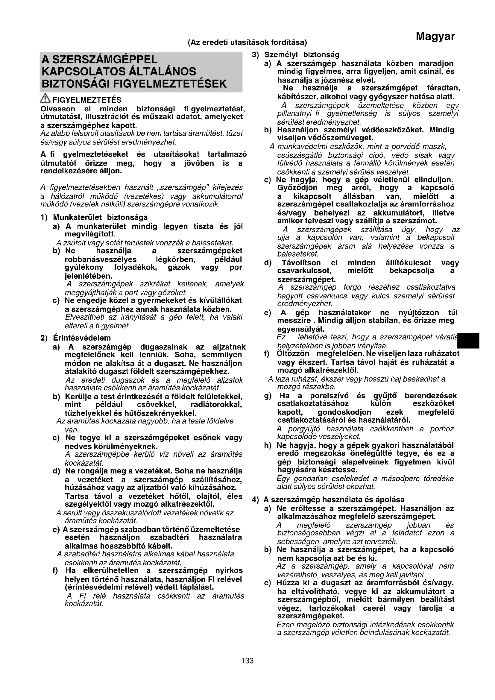 FIGYELMEZTETÉS Olvasson el minden biztonsági fi gyelmeztetést, útmutatást, illusztrációt és műszaki adatot, amelyeket a szerszámgéphez kapott. Az alább felsorolt utasítások be nem tartása áramütést, tüzet és/vagy súlyos sérülést eredményezhet. A fi gyelmeztetéseket és utasításokat tartalmazó útmutatót őrizze meg, hogy a jövőben is a rendelkezésére álljon. A fi gyelmeztetésekben használt „szerszámgép” kifejezés a hálózatról működő (vezetékes) vagy akkumulátorról működő (vezeték nélküli) szerszámgépre vonatkozik.