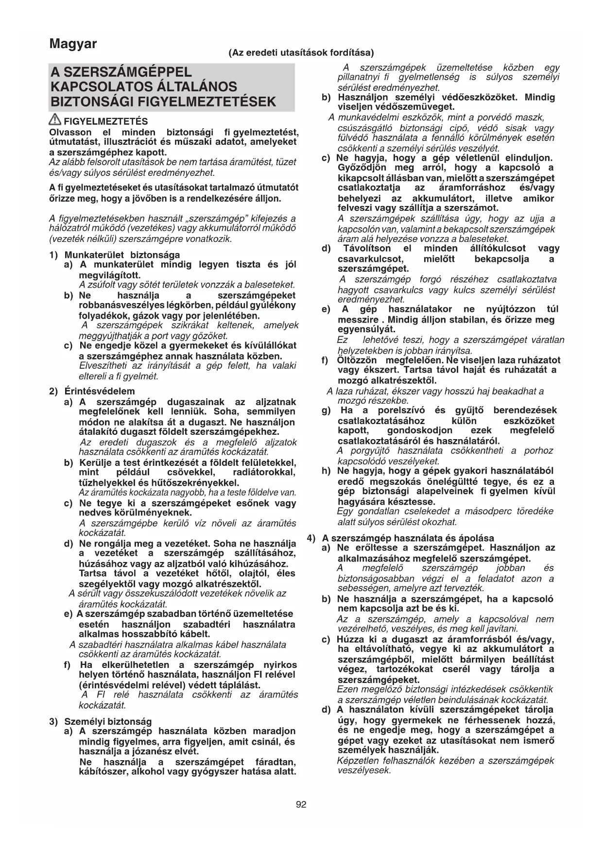 FIGYELMEZTETÉS Olvasson el minden biztonsági fi gyelmeztetést, útmutatást, illusztrációt és műszaki adatot, amelyeket a szerszámgéphez kapott. Az alább felsorolt utasítások be nem tartása áramütést, tüzet és/vagy súlyos sérülést eredményezhet. A fi gyelmeztetéseket és utasításokat tartalmazó útmutatót őrizze meg, hogy a jövőben is a rendelkezésére álljon. A fi gyelmeztetésekben használt „szerszámgép” kifejezés a hálózatról működő (vezetékes) vagy akkumulátorról működő (vezeték nélküli) szerszámgépre vonatkozik.
