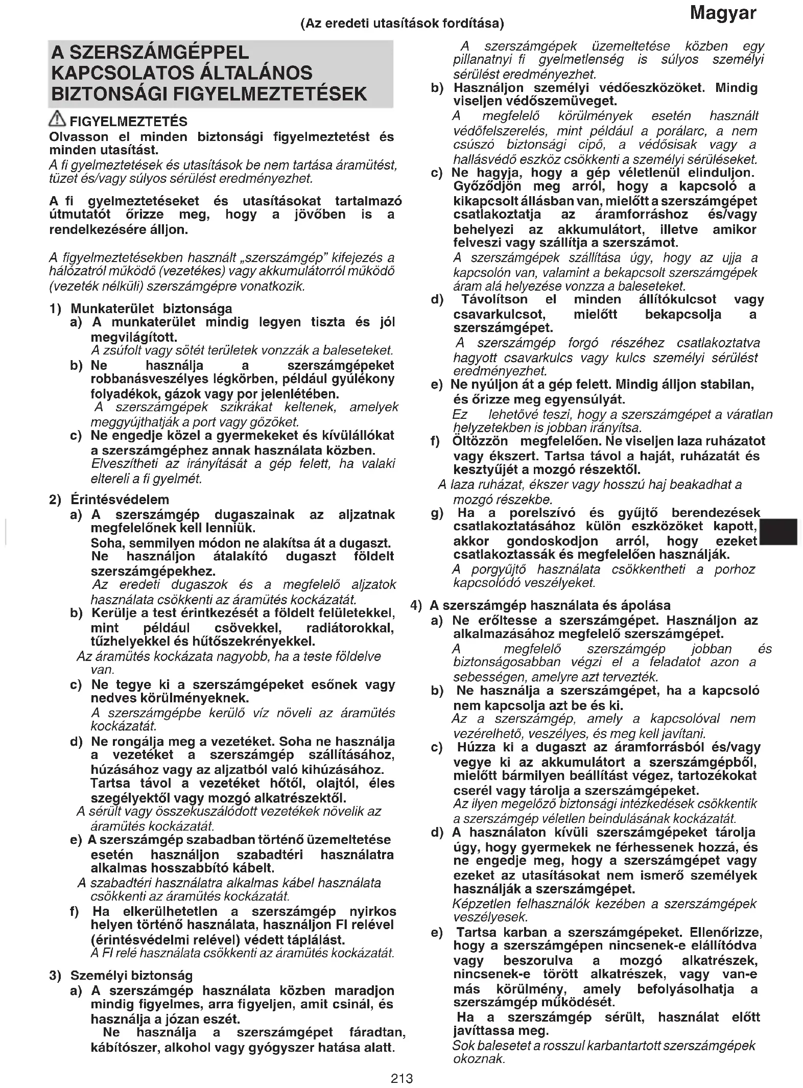 FIGYELMEZTETÉS Olvasson el minden biztonsági fi gyelmeztetést és minden utasítást. A fi gyelmeztetések és utasítások be nem tartása áramütést, tüzet és/vagy súlyos sérülést eredményezhet. A fi gyelmeztetéseket és utasításokat tartalmazó útmutatót őrizze meg, hogy a jövőben is a rendelkezésére álljon. A fi gyelmeztetésekben használt „szerszámgép” kifejezés a hálózatról működő (vezetékes) vagy akkumulátorról működő (vezeték nélküli) szerszámgépre vonatkozik.