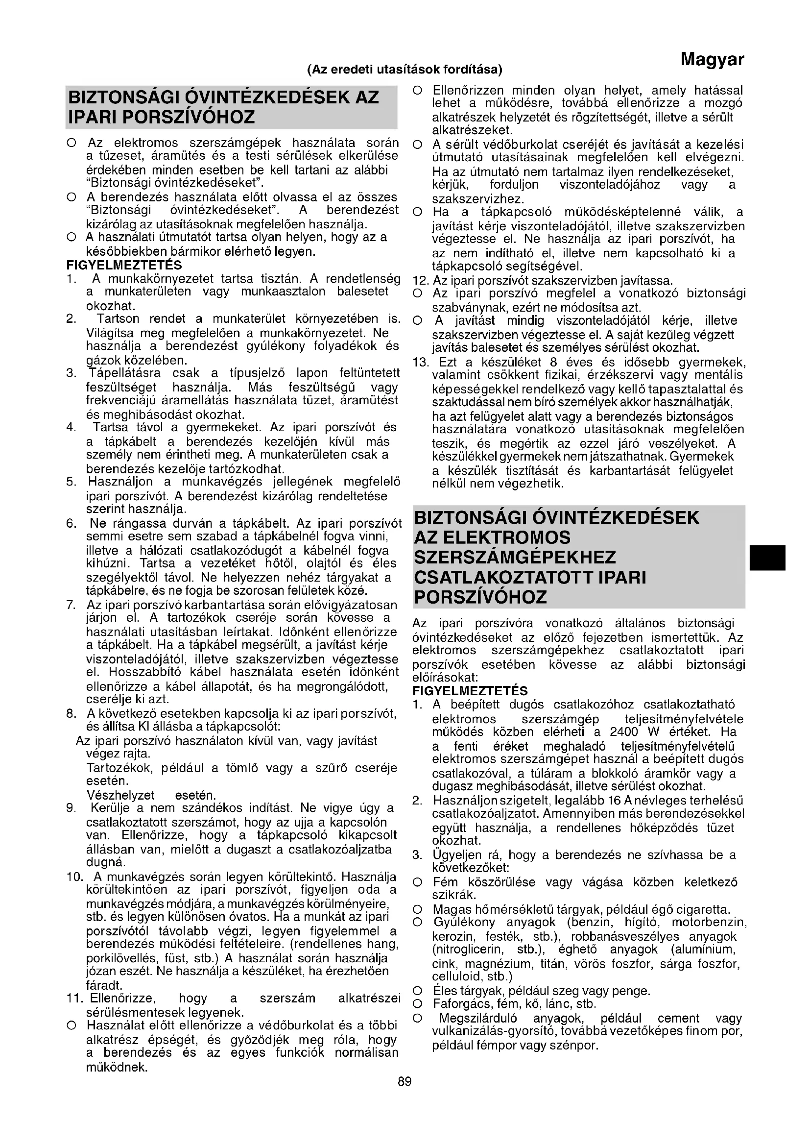 Az ipari porszívóra vonatkozó általános biztonsági óvintézkedéseket az előző fejezetben ismertettük. Az elektromos szerszámgépekhez csatlakoztatott ipari porszívók esetében kövesse az alábbi biztonsági előírásokat: FIGYELMEZTETÉS