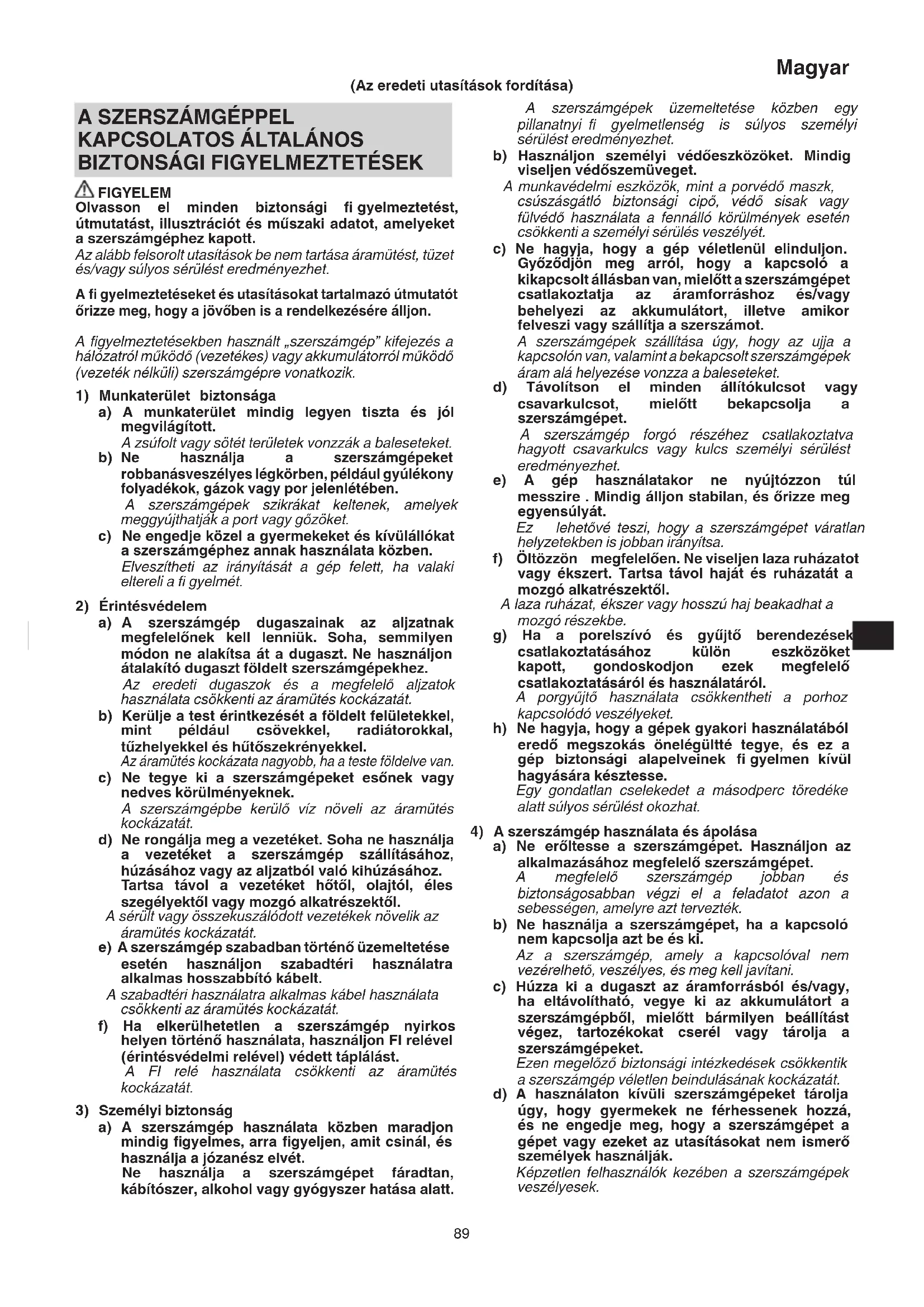 FIGYELEM Olvasson el minden biztonsági fi gyelmeztetést, útmutatást, illusztrációt és műszaki adatot, amelyeket a szerszámgéphez kapott. Az alább felsorolt utasítások be nem tartása áramütést, tüzet és/vagy súlyos sérülést eredményezhet. A fi gyelmeztetéseket és utasításokat tartalmazó útmutatót őrizze meg, hogy a jövőben is a rendelkezésére álljon. A fi gyelmeztetésekben használt „szerszámgép” kifejezés a hálózatról működő (vezetékes) vagy akkumulátorról működő (vezeték nélküli) szerszámgépre vonatkozik.
