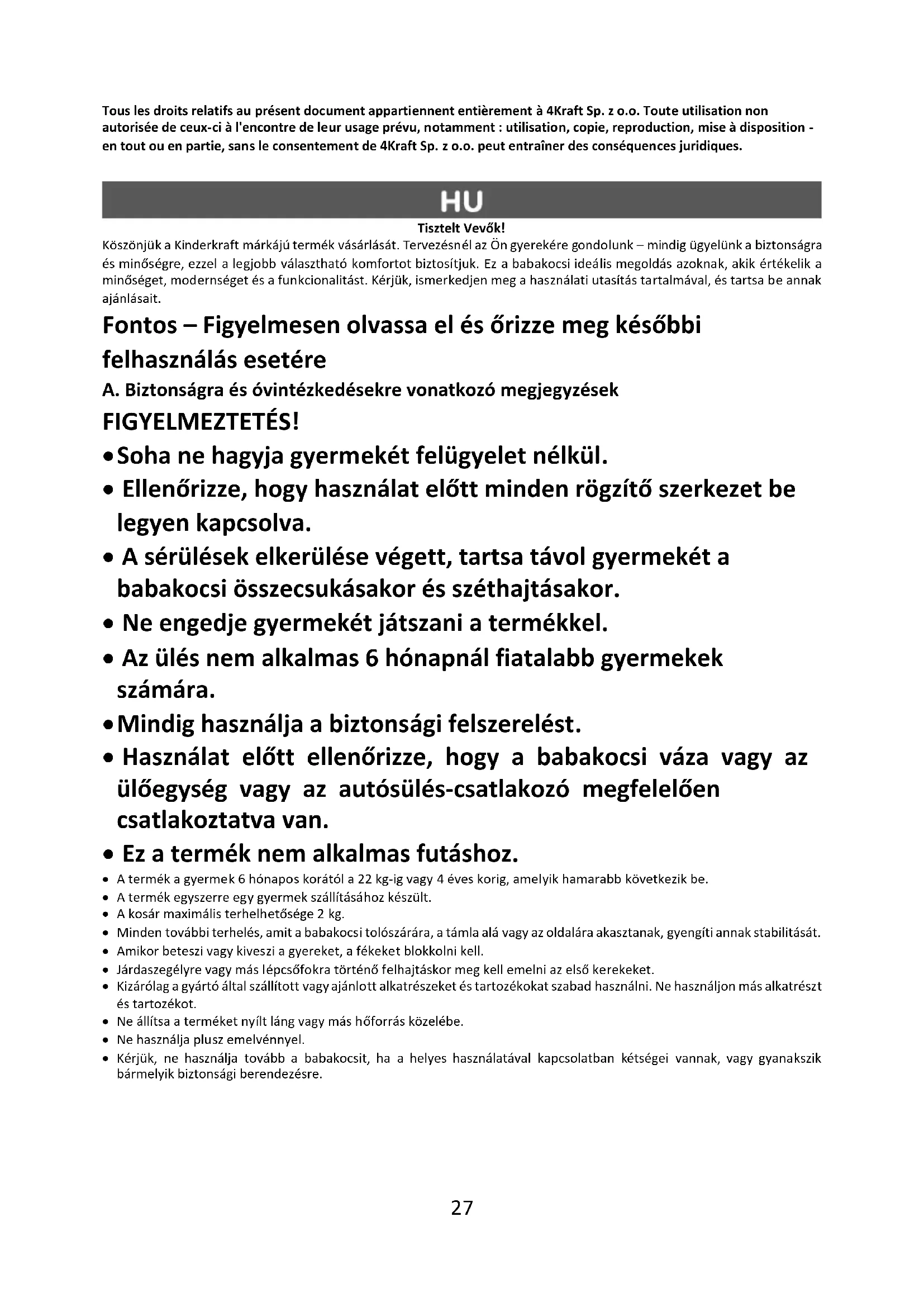 J. Harmadik fél alkatrészei vagy termékei által okozott kár - ideértve, de nem kizárólag: pohártartó, esernyő, fényvisszaverő elemek, csengők; K. Szállítás közben keletkező vagy légitársaság személyzete által okozott kár. 8. A készülékhez mellékelt tartozékok garanciális időtartama az értékesítéstől számítva 6 hónap, a fent említett sérüléseket leszámítva.30 9. Jelen garanciális feltételek kiegészítő jellegűek az Ügyfelet a 4KRAFT sp. z o.o.-val szemben megillető jogokhoz képest. Jelen garancia nem zárja ki és nem korlátozza vagy függeszti fel az eladott termékek meghibásodására vonatkozó előírásokból eredő fogyasztói jogokat. 10.A részletes Garanciális Feltételek weboldalunkon olvashatók: WWW.KINDERKRAFT.COM A jelen dokumentumhoz való jog teljes egészében a 4Kraft Sp. z o.o. vállalaté. A felhatalmazás nélküli, rendeltetésnek nem megfelelő felhasználása, különösképpen: a másolása, sokszorsítása, megosztása – részben vagy teljes egészében, a 4Kraft Sp. z o.o. külön engedélye nélkül, jogi következményeket vonhat maga után. Gentili Clienti, Grazie per aver acquistato il prodotto del marchio Kinderkraft.I nostri prodotti sono stati progettati pensando alla sicurezza e al comfort del bambino. La carrozzina è una soluzione ideale per chi apprezza la qualità, modernità e funzionalità. Si prega di leggere il contenuto del presente manuale e seguire le sue istruzioni. IMPORTANTE – Leggere attentamente e conservare per futuro riferimento. A. Informazioni importanti sulla sicurezza e sulle precauzioni da osservare ATTENZIONE!