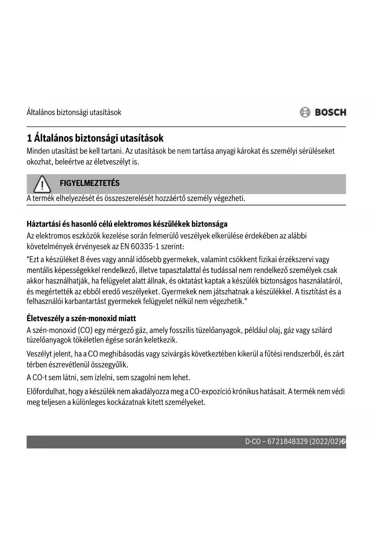 - Sl. 15: memorija alarma Opis simbola tab. 1 Opis simbola Upozorenje o ugljičnom monoksidu Vlažnost Jamstvo u trajanju od pet godina Informacije Otpadna električna i elektronička oprema (OEEO) – europska Direktiva (2012/19/EU) Postavljanje Vrsta proizvoda Održavanje Vijek trajanja baterije Upozorenje Temperatura Opasnost za život xÁltalános biztonsági utasítások D-CO – 6721848329 (2022/02)66 1 Általános biztonsági utasítások Minden utasítást be kell tartani. Az utasítások be nem tartása anyagi károkat és személyi sérüléseket okozhat, beleértve az életveszélyt is. FIGYELMEZTETÉS A termék elhelyezését és összeszerelését hozzáértő személy végezheti. Háztartási és hasonló célú elektromos készülékek biztonsága Az elektromos eszközök kezelése során felmerülő veszélyek elkerülése érdekében az alábbi követelmények érvényesek az EN 60335-1 szerint: "Ezt a készüléket 8 éves vagy annál idősebb gyermekek, valamint csökkent fizikai érzékszervi vagy mentális képességekkel rendelkező, illetve tapasztalattal és tudással nem rendelkező személyek csak akkor használhatják, ha felügyelet alatt állnak, és oktatást kaptak a készülék biztonságos használatáról, és megértették az ebből eredő veszélyeket. Gyermekek nem játszhatnak a készülékkel. A tisztítást és a felhasználói karbantartást gyermekek felügyelet nélkül nem végezhetik." Életveszély a szén-monoxid miatt A szén-monoxid (CO) egy mérgező gáz, amely fosszilis tüzelőanyagok, például olaj, gáz vagy szilárd tüzelőanyagok tökéletlen égése során keletkezik. Veszélyt jelent, ha a CO meghibásodás vagy szivárgás következtében kikerül a fűtési rendszerből, és zárt térben észrevétlenül összegyűlik. A CO-t sem látni, sem ízlelni, sem szagolni nem lehet. Előfordulhat, hogy a készülék nem akadályozza meg a CO-expozíció krónikus hatásait. A termék nem védi meg teljesen a különleges kockázatnak kitett személyeket.Általános biztonsági utasítások 67D-CO – 6721848329 (2022/02) Rendszeresen ellenőriztesse és szervizeltesse a rendszert egy jóváhagyott vállalkozóval. FIGYELMEZTETÉS A riasztó felszerelése nem helyettesítheti a tüzelőrendszerek megfelelő telepítését, használatát és karbantartását, beleértve a megfelelő szellőző- és elszívórendszereket. Mi a teendő szén-monoxid riasztás esetén? ▶ Maradjon nyugodt, és nyissa ki az összes ajtót és ablakot a szellőzés fokozása érdekében ▶ Szüntesse be az összes tüzelőrendszer használatát, és lehetőség szerint kapcsolja ki azokat. Például gázkészülékeknél szigetelje el a vészszabályozó szelepet. ▶ Ha a riasztás továbbra is aktiválva marad, hagyja el az épületet, és csak akkor térjen vissza, ha a megszűnt riasztás. Többlakásos és többszintes ingatlanok esetében figyelmeztesse az összes lakót a veszélyre ▶ Kérjen orvosi segítséget bárkinek, akinek szén-monoxid mérgezése van, és kérjen tanácsot, ha szén- monoxid belélegzését gyanítja. ▶ Vegye fel a kapcsolatot a megfelelő szervizzel és/vagy karbantartó ügynökséggel. Szükség esetén vegye fel a kapcsolatot az tüzelőanyag-szolgáltatóval a segélyhívószámukon, illetve az országos gázsürgősségi szolgáltatóval. Így azonosítható és korrigálható a szén-monoxid kibocsátás forrása. ▶ Ne használjon újra tüzelőanyagot hasznosító készülékeket, amíg azt egy illetékes személy nem ellenőrizte és nem engedélyezte a nemzeti előírásoknak megfelelően.Termékinformáció D-CO – 6721848329 (2022/02)68 FIGYELMEZTETÉS Életveszély! Abban az esetben, ha a készülék némítását fontolgatja, vegye figyelembe, hogy a riasztó a szén-monoxid veszélyes szintje miatt aktiválódott, és veszélyes a készülék környezetében tartózkodni. 2 Termékinformáció