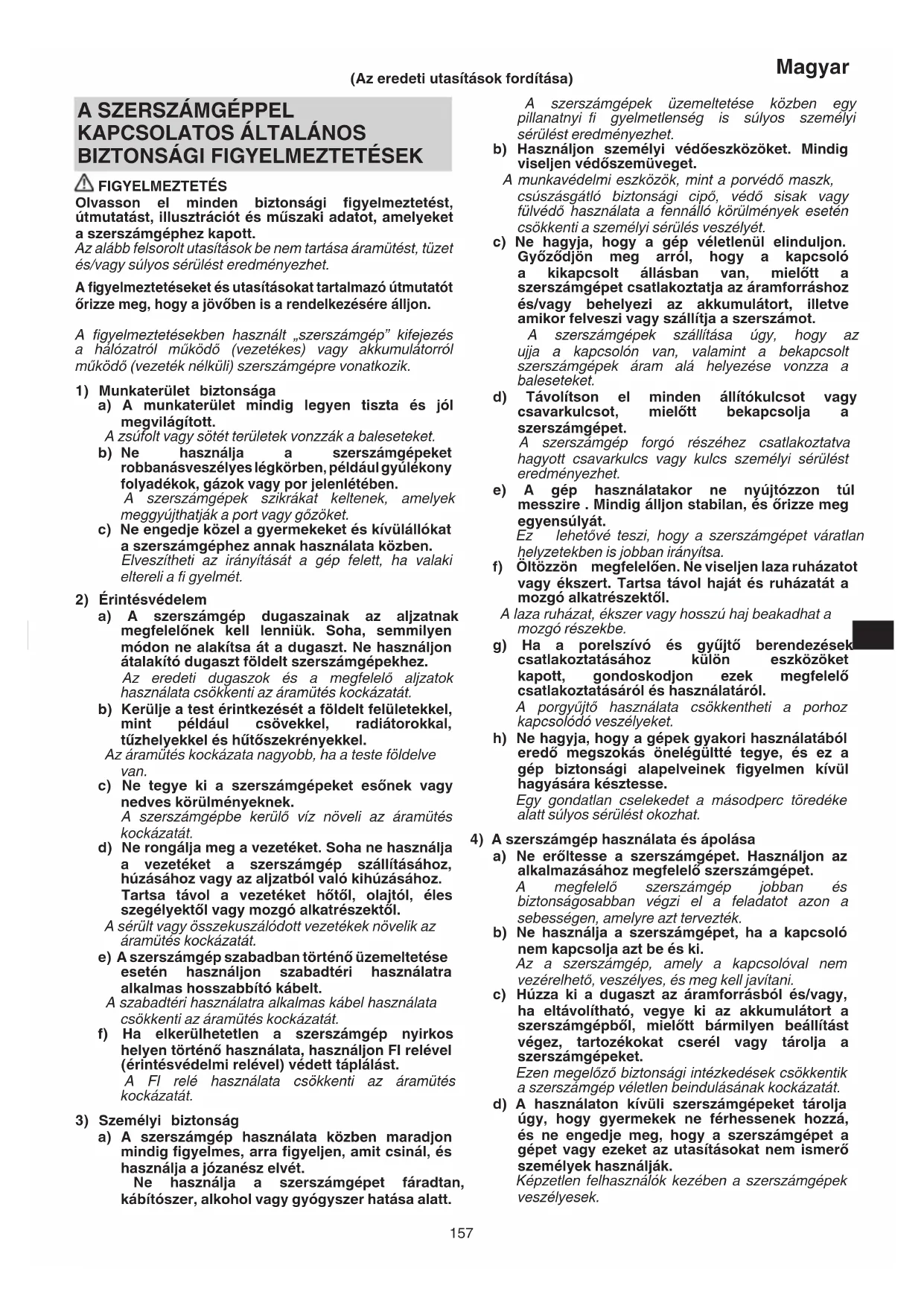 FIGYELMEZTETÉS Olvasson el minden biztonsági fi gyelmeztetést, útmutatást, illusztrációt és műszaki adatot, amelyeket a szerszámgéphez kapott. Az alább felsorolt utasítások be nem tartása áramütést, tüzet és/vagy súlyos sérülést eredményezhet. A fi gyelmeztetéseket és utasításokat tartalmazó útmutatót őrizze meg, hogy a jövőben is a rendelkezésére álljon. A fi gyelmeztetésekben használt „szerszámgép” kifejezés a hálózatról működő (vezetékes) vagy akkumulátorról működő (vezeték nélküli) szerszámgépre vonatkozik.