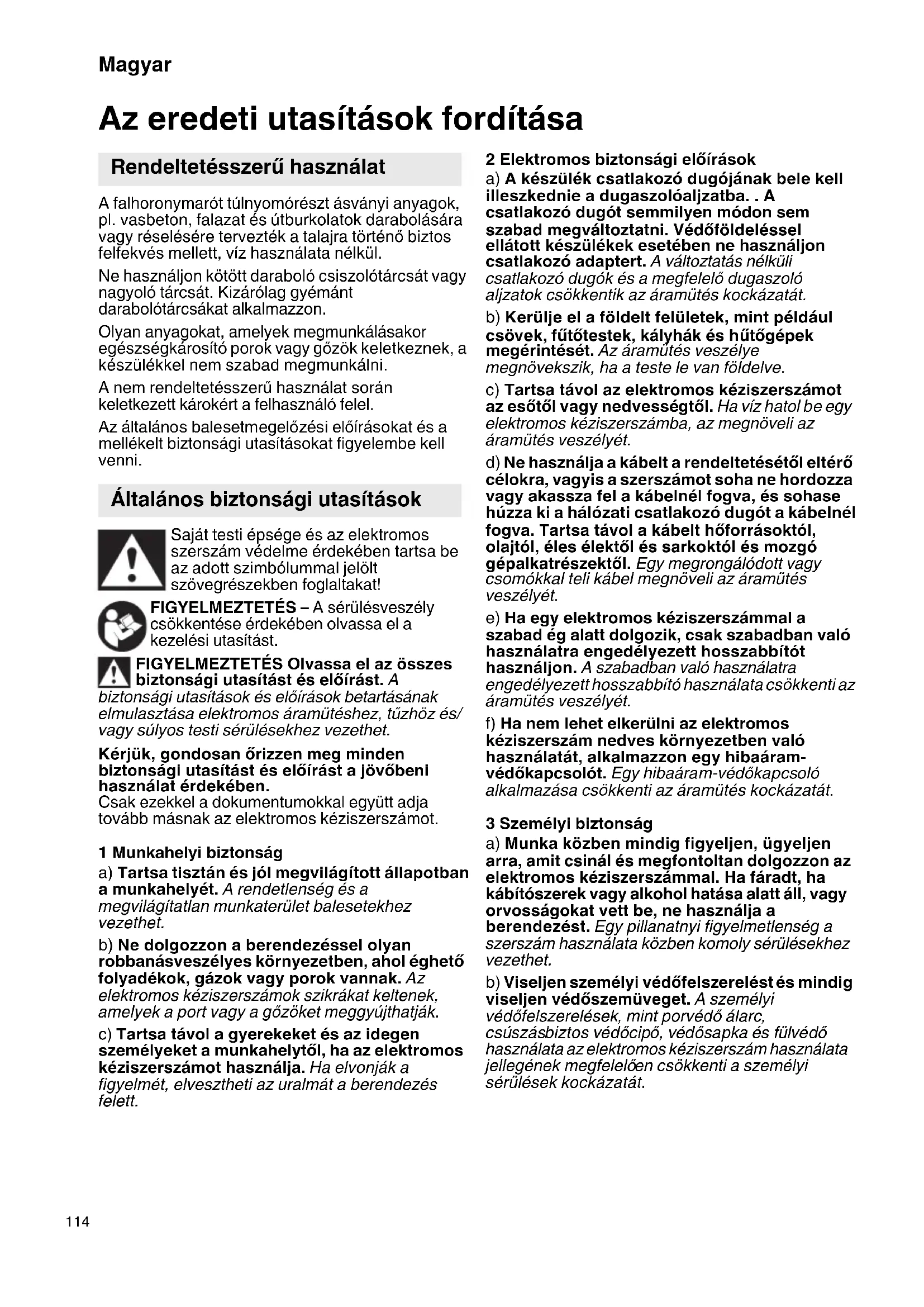 Ne használjon olyan elektromos kéziszerszámot, amelynek a kapcsolója elromlott. Egy olyan elektromos kéziszerszám, amelyet nem lehet sem be-, sem kikapcsolni, veszélyes és meg kell javíttatni. c) Húzza ki a csatlakozó dugót a dugaszolóaljzatból és/vagy távolítsa el az akkumulátor-csomagot (ha az leválasztható) az elektromos kéziszerszámtól, mielőtt az elektromos kéziszerszámon beállítási munkákat végez, tartozékokat cserél vagy a szerszámot tárolásra elteszi. Ez az elővigyázatossági intézkedés meggátolja a szerszám akaratlan üzembe helyezését. d) A használaton kívüli elektromos kéziszerszámokat olyan helyen tárolja, ahol azokhoz gyerekek nem férhetnek hozzá. Ne hagyja, hogy olyan személyek használják az elektromos kéziszerszámot, akik nem ismerik a szerszámot, vagy nem olvasták el ezt az útmutatót. Az elektromos kéziszerszámok veszélyesek, ha azokat gyakorlatlan személyek használják. e) Az elektromos kéziszerszámot és tartozékait gondosan tartsa karban. Ellenőrizze, hogy a mozgó alkatrészek kifogástalanul működnek-e, nincsenek-e beszorulva, és nincsenek-e eltörve vagy megrongálódva olyan alkatrészek, amelyek hatással lehetnek az elektromos kéziszerszám működésére. A berendezés megrongálódott részeit a készülék használata előtt javíttassa meg. Sok olyan baleset történik, amelyet az elektromos kéziszerszám nem kielégítő karbantartására lehet visszavezetni. f) Tartsa tisztán és éles állapotban a vágószerszámokat. Az éles vágóélekkel rendelkező és gondosan ápolt vágószerszámok ritkábban ékelődnek be és azokat könnyebben lehet vezetni és irányítani. g) Az elektromos kéziszerszámokat, tartozékokat, betétszerszámokat stb. csak ezen előírásoknak és az adott készüléktípusra vonatkozó kezelési utasításoknak megfelelően használja. Vegye figyelembe a munkafeltételeket és a kivitelezendő munka sajátosságait. Az elektromos kéziszerszám eredeti rendeltetésétől eltérő célokra való alkalmazása veszélyes helyzetekhez vezethet. h) Tartsa szárazon, tisztán és olaj- és zsírmentes állapotban a fogantyúkat és markoló felületeket. A csúszós fogantyúk és markoló felületek váratlan helyzetekben lehetetlenné teszik az elektromos kéziszerszám biztonságos kezelését és irányítását. 5Szervíz-ellenő rzés a) Az elektromos kéziszerszámot csak szakképzett személyzet csak eredeti pótalkatrészek felhasználásávaljavíthatja. Ez biztosítja, hogy az elektromos kéziszerszám biztonságos maradjon. 1 Daraboló-csiszoló gépekre vonatkozó biztonsági tudnivalók a) Az elektromos kéziszerszámhoz tartozó védőburát biztonságosan kell felszerelni és úgy kell beállítani, hogy a lehető legnagyobb biztonságot nyújtsa, azaz a csiszoló testnek a lehető legkisebb része legyen szabadon és veszélyeztesse ily módon a kezelőt. Maradjon Ön és a közelben levő személyek is távol a forgó csiszolótárcsa síkjától. A védőbura feladata, hogy védje a kezelőt a szilánkoktól és attól, hogy véletlenül érintkezésbe kerüljön a csiszolószerszámmal. Különleges biztonsági utasítások 000book_CM5MA.book 115 ページ 2022年7月20日 水曜日 午後4時50分116 Magyar b) Kizárólag gyémánt vágókereket használjon az elektromos kéziszerszámhoz. Önmagában az, hogy egy adott tartozék az elektromos kéziszerszámra felszerelhető, még nem garantálja annak biztonságos használhatóságát. c) A betétszerszám megengedett fordulatszámának el kell érnie legalább az elektromos kéziszerszámon megadott maximális fordulatszám értékét. A megengedettnél gyorsabban forgó tartozék eltörhet és darabjai szétrepülhetnek. d) A csiszolószerszámok csak a javasolt alkalmazási területükön használhatóak. Pl.: Soha ne végezzen csiszolást a darabolótárcsa oldalfelületével. A darabolótárcsa rendeltetésszerű használatakor a tárcsa peremét használja anyaglehordásra. A csiszolótest a ráható oldalirányú erő következtében eltörhet. e) Mindig sértetlen, megfelelő méretű és alakú szorítókarimát használjon a kiválasztott csiszolótárcsához. A megfelelő karima megtámasztja a csiszolótárcsát, így csökkenti annak veszélyét, hogy a csiszolótárcsa eltörjön. f) A betétszerszám külső átmérőjének és vastagságának meg kell felelnie az elektromos kéziszerszámhoz előírt méretadatoknak. A helytelenül méretezett betétszerszámot nem lehet kellően árnyékolni vagy ellenőrizni. g) A csiszolótárcsáknak és szorítókarimáknak pontosan kell illeszkedniük az elektromos kéziszerszám csiszolótengelyére. Ha a szerszám nem illeszkedik pontosan az elektromos kéziszerszám csiszolótengelyére, egyenetlen lesz a forgása, erőteljesen megnövekedhet a rezgése, és a kezelő elveszítheti uralmát a gép fölött. h) Ne használjon sérült csiszolótárcsát. A csiszolótárcsa minden használatba vétele előtt ellenőrizze, hogy nem pattogtak-e le róla szilánkok, és nincsenek-e rajta repedések. Ha az elektromos kéziszerszám vagy a csiszolótárcsa leesik, ellenőrizze, hogy nem sérült-e meg, vagy használjon sértetlen csiszolótárcsát. Ha ellenőrizte és felszerelte a csiszolótárcsát, győződjön meg arról, hogy sem Ön, sem a közelben levő más személy nincs a forgó csiszolótárcsa síkjában, majd egy percre kapcsolja maximális fordulatszámra a készüléket. A sérült csiszolótárcsa általában már ezalatt a tesztidő alatt eltörik.