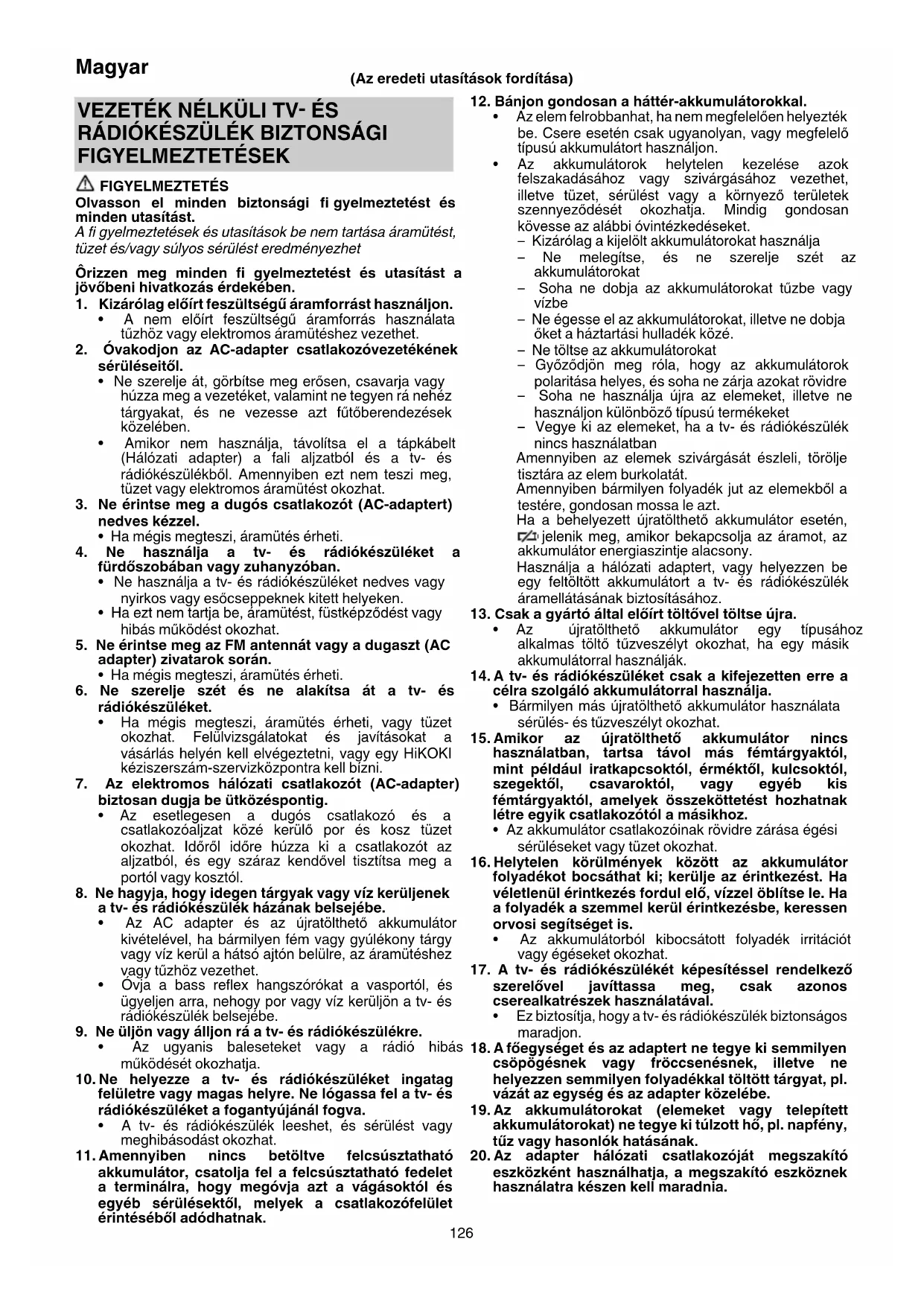 A nem várt problémák léphetnek fel a tv- és rádiókészülékhez csatlakoztatott okostelefonon vagy más perifériális berendezésen tárolt adatok elvesztése vagy sérülése formájában. Ezt mindig tartsa észben, és időben gondoskodjon az adatok mentéséről. Vegye fi gyelembe, hogy a HiKOKI nem tehető felelőssé sem a tv- és rádiókészülékhez csatlakoztatott okostelefonon vagy más perifériális berendezésen tárolt adatok, sem magának a berendezésnek a sérüléséért.