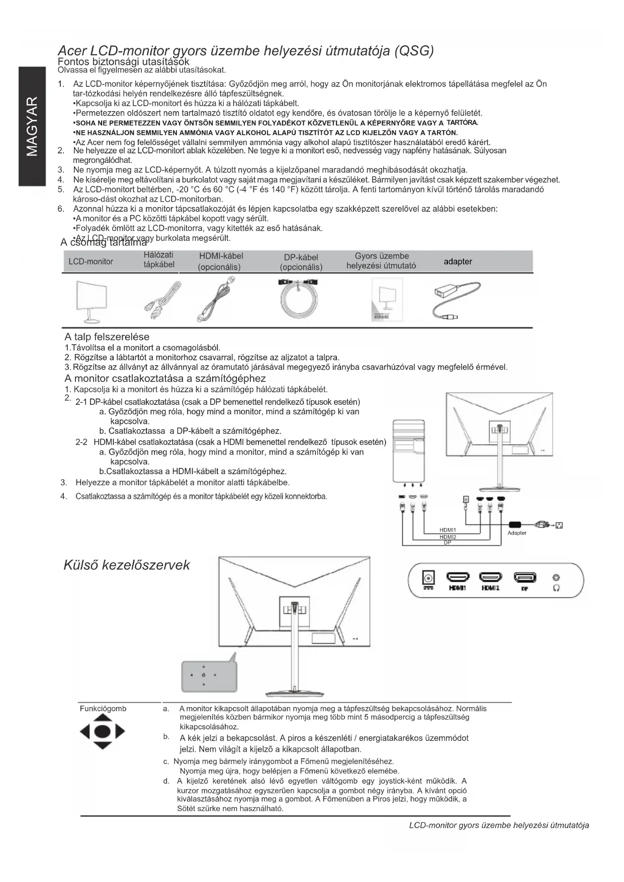 - Kérjen segítséget kereskedőjétől vagy gyakorlott rádió/televízió szakembertől. CE megfelelőségi nyilatkozat Az Acer Inc., ezúton kijelenti, hogy ez az LCD-monitor megfelel a 2014/30/EU EMC zavartűrési irányelv, a 2014/35/EU kisfeszültségű irányelv és a 2011/65/EU RoHS irányelv alapvető követelményeinek és egyéb vonatkozórendelkezéseinek, valamint az energia vonatkozású termékek ökológiai tervezési követelményeinek felállításáról szóló keretrendszer létrehozásával kapcsolatos 2009/125/EK irányelvnek. Megjegyzés: Árnyékolt kábelek Minden más számítástechnikai eszközhöz való csatlakoztatás árnyékolt kábelekkel történik az EMC-re vonatkozó előírásoknak való megfelelés érdekében. Megjegyzés: Perifériák Kizárólag olyan perifériákat (bemeneti/kimeneti eszközök, terminálok, nyomtatók stb.) szabad ehhez a berendezéshez csatlakoztatni, amelyek a B osztályú eszközökre előírt határértékeknek megfelelnek. A határértékeknek nem megfelelő perifériák használata esetén zavar léphet fel a rádió- és televíziós vételben. Figyelem A gyártó által nem engedélyezett változtatások vagy módosítások miatt a felhasználó elveszítheti a Federal Communications Commission (Szövetségi Távközlési Bizottság) által biztosított jogát, hogy ezt a terméket működtesse. Üzemi feltételek Az eszköz megfelel az FCC-előírások 15. fejezetében meghatározott határértékeknek. A működtetésnek az alábbi két feltétele van: (1) Az eszköz nem okozhat káros zavart, és (2), az eszköznek minden zavart fogadnia kell, beleértve a nem kívánatos működést okozó zavarokat is. Megjegyzés: Kanadai felhasználók Ez a B osztályú digitális készülék megfelel a kanadai ICES-003 szabványnak. Remarque à l'intention des utilisateurs canadiens Cet appareil numérique de la classe B est conforme a la norme NMB-003 du Canada. Elhasznált berendezések ártalmatlanítása felhasználók által az Európai Unióban lévő magánháztartásokban. Az ilyen jelzéssel ellátott terméket, illetve csomagolását nem szabad háztartási szemétként kezelni. Ehelyett Önre hárul a felelősség, hogy a hulladék berendezést a hulladék elektromos és elektronikus berendezések ártalmatlanítására kijelölt begyűjtési ponton adja le. A hulladékká vált elektronikus berendezés elkülönített begyűjtésével és újrahasznosításával segít megőrizni a természeti erőforrásokat és biztosítja, hogy az egészséget és a környezetet védő módon hasznosítják újra. További tájékoztatásért a begyűjtőket és a termék újrahasznosítását illetően kérjük, lépjen kapcsolatba a helyi önkormányzattal, a kommunális hulladékkezelővel vagy azzal az üzlettel, ahol a terméket megvásárolta. A monitor károsodásának elkerülése érdekében ne emelje a monitort a bázisán. Az Acer monitort az elektronikus készülékekhez kapott információk videó és képi megjelenítése céljából kell megjeleníteni. FreeSync (csakHDMI/DP):Lehetővé teszi, hogy egy FreeSync-kompatibilis grafika forrás dinamikusan állítsa a képfrissítési sebességéet a tartalom jellemző képsebességétől függően az energiahatékony, gyakorlatilag rázkódásmentes és alacsony késlekedésű képfrissítéshez.MAGY