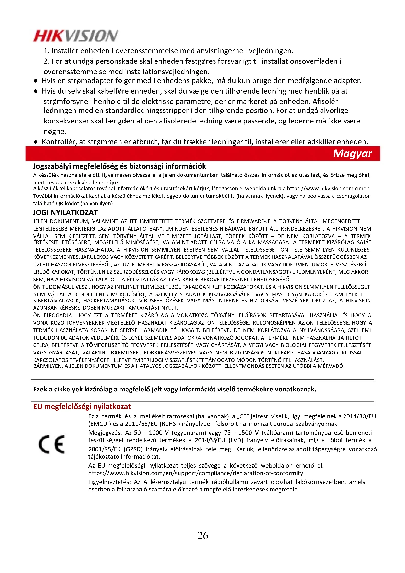 overensstemmelse med installationsvejledningen. ● Hvis en strømadapter følger med i enhedens pakke, må du kun bruge den medfølgende adapter. ● Hvis du selv skal kabelføre enheden, skal du vælge den tilhørende ledning med henblik på at strømforsyne i henhold til de elektriske parametre, der er markeret på enheden. Afisolér ledningen med en standardledningsstripper i den tilhørende position. For at undgå alvorlige konsekvenser skal længden af den afisolerede ledning være passende, og lederne må ikke være nøgne. ● Kontrollér, at strømmen er afbrudt, før du trækker ledninger til, installerer eller adskiller enheden. Magyar Jogszabályi megfelelőség és biztonsági információk A készülék használata előtt figyelmesen olvassa el a jelen dokumentumban található összes információt és utasítást, és őrizze meg őket, mert később is szüksége lehet rájuk. A készülékkel kapcsolatos további információkért és utasításokért kérjük, látogasson el weboldalunkra a https://www.hikvision.com címen. További információkat kaphat a készülékhez mellékelt egyéb dokumentumokból is (ha vannak ilyenek), vagy ha beolvassa a csomagoláson található QR-kódot (ha van ilyen). JOGI NYILATKOZAT JELEN DOKUMENTUM, VALAMINT AZ ITT ISMERTETETT TERMÉK SZOFTVERE ÉS FIRMWARE-JE A TÖRVÉNY ÁLTAL MEGENGEDETT LEGTELJESEBB MÉRTÉKIG „AZ ADOTT ÁLLAPOTBAN”, „MINDEN ESETLEGES HIBÁJÁVAL EGYÜTT ÁLL RENDELKEZÉSRE”. A HIKVISION NEM VÁLLAL SEM KIFEJEZETT, SEM TÖRVÉNY ÁLTAL VÉLELMEZETT JÓTÁLLÁST, TÖBBEK KÖZÖTT – DE NEM KORLÁTOZVA – A TERMÉK ÉRTÉKESÍTHETŐSÉGÉRE, MEGFELELŐ MINŐSÉGÉRE, VALAMINT ADOTT CÉLRA VALÓ ALKALMASSÁGÁRA. A TERMÉKET KIZÁRÓLAG SAJÁT FELELŐSSÉGÉRE HASZNÁLHATJA. A HIKVISION SEMMILYEN ESETBEN SEM VÁLLAL FELELŐSSÉGET ÖN FELÉ SEMMILYEN KÜLÖNLEGES, KÖVETKEZMÉNYES, JÁRULÉKOS VAGY KÖZVETETT KÁRÉRT, BELEÉRTVE TÖBBEK KÖZÖTT A TERMÉK HASZNÁLATÁVAL ÖSSZEFÜGGÉSBEN AZ ÜZLETI HASZON ELVESZTÉSÉBŐL, AZ ÜZLETMENET MEGSZAKADÁSÁBÓL, VALAMINT AZ ADATOK VAGY DOKUMENTUMOK ELVESZTÉSÉBŐL EREDŐ KÁROKAT, TÖRTÉNJEN EZ SZERZŐDÉSSZEGÉS VAGY KÁROKOZÁS (BELEÉRTVE A GONDATLANSÁGOT) EREDMÉNYEKÉNT, MÉG AKKOR SEM, HA A HIKVISION VÁLLALATOT TÁJÉKOZTATTÁK AZ ILYEN KÁROK BEKÖVETKEZÉSÉNEK LEHETŐSÉGÉRŐL. ÖN TUDOMÁSUL VESZI, HOGY AZ INTERNET TERMÉSZETÉBŐL FAKADÓAN REJT KOCKÁZATOKAT, ÉS A HIKVISION SEMMILYEN FELELŐSSÉGET NEM VÁLLAL A RENDELLENES MŰKÖDÉSÉRT, A SZEMÉLYES ADATOK KISZIVÁRGÁSÁÉRT VAGY MÁS OLYAN KÁROKÉRT, AMELYEKET KIBERTÁMADÁSOK, HACKERTÁMADÁSOK, VÍRUSFERTŐZÉSEK VAGY MÁS INTERNETES BIZTONSÁGI VESZÉLYEK OKOZTAK; A HIKVISION AZONBAN KÉRÉSRE IDŐBEN MŰSZAKI TÁMOGATÁST NYÚJT. ÖN ELFOGADJA, HOGY EZT A TERMÉKET KIZÁRÓLAG A VONATKOZÓ TÖRVÉNYI ELŐÍRÁSOK BETARTÁSÁVAL HASZNÁLJA, ÉS HOGY A VONATKOZÓ TÖRVÉNYEKNEK MEGFELELŐ HASZNÁLAT KIZÁRÓLAG AZ ÖN FELELŐSSÉGE. KÜLÖNÖSKÉPPEN AZ ÖN FELELŐSSÉGE, HOGY A TERMÉK HASZNÁLATA SORÁN NE SÉRTSE HARMADIK FÉL JOGAIT, BELEÉRTVE, DE NEM KORLÁTOZVA A NYILVÁNOSSÁGRA, SZELLEMI TULAJDONRA, ADATOK VÉDELMÉRE ÉS EGYÉB SZEMÉLYES ADATOKRA VONATKOZÓ JOGOKAT. A TERMÉKET NEM HASZNÁLHATJA TILTOTT CÉLRA, BELEÉRTVE A TÖMEGPUSZTÍTÓ FEGYVEREK FEJLESZTÉSÉT VAGY GYÁRTÁSÁT, A VEGYI VAGY BIOLÓGIAI FEGYVEREK FEJLESZTÉSÉT VAGY GYÁRTÁSÁT, VALAMINT BÁRMILYEN, ROBBANÁSVESZÉLYES VAGY NEM BIZTONSÁGOS NUKLEÁRIS HASADÓANYAG-CIKLUSSAL KAPCSOLATOS TEVÉKENYSÉGET, ILLETVE EMBERI JOGI VISSZAÉLÉSEKET TÁMOGATÓ MÓDON TÖRTÉNŐ FELHASZNÁLÁST. BÁRMILYEN, A JELEN DOKUMENTUM ÉS A HATÁLYOS JOGSZABÁLYOK KÖZÖTTI ELLENTMONDÁS ESETÉN AZ UTÓBBI A MÉRVADÓ.