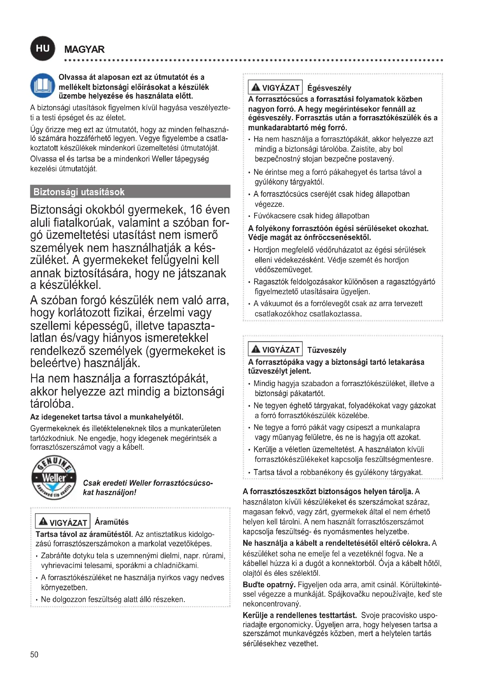 POLSKI50 Olvassa át alaposan ezt az útmutatót és a mellékelt biztonsgi előírsokat a készülék üzembe helyezése és hasznlata előtt. A biztonsági utasítások gyelmen kívül hagyása veszélyezte- ti a testi épséget és az életet. Úgy őrizze meg ezt az útmutatót, hogy az minden felhaszná- ló számára hozzáférhető legyen. Vegye gyelembe a csatla- koztatott készülékek mindenkori üzemeltetési útmutatóját. Olvassa el és tartsa be a mindenkori Weller tápegység kezelési útmutatóját. Biztonsági utasítások Biztonsági okokból gyermekek, 16 éven aluli atalkorúak, valamint a szóban for- gó üzemeltetési utasítást nem ismerő személyek nem használhatják a kés- züléket. A gyermekeket felügyelni kell annak biztosítására, hogy ne játszanak a készülékkel. A szóban forgó készülék nem való arra, hogy korlátozott zikai, érzelmi vagy szellemi képességű, illetve tapaszta