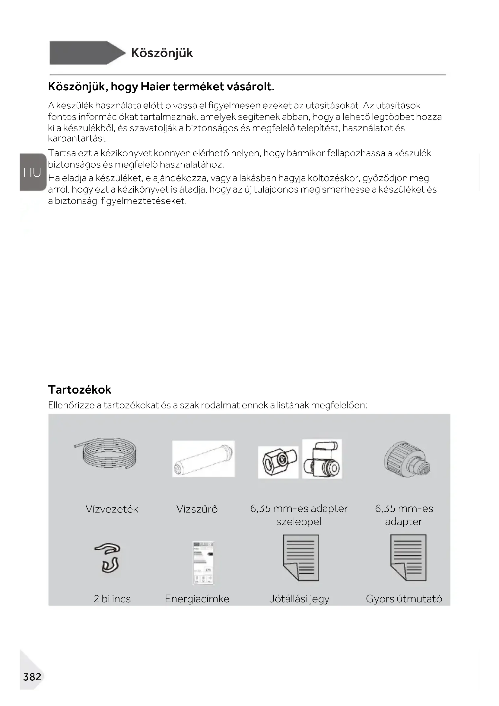 Köszönjük, hogy Haier terméket vásárolt. A készülék használata előtt olvassa el figyelmesen ezeket az utasításokat. Az utasítások fontos információkat tartalmaznak, amelyek segítenek abban, hogy a lehető legtöbbet hozza ki a készülékből, és szavatolják a biztonságos és megfelelő telepítést, használatot és karbantartást. Tartsa ezt a kézikönyvet könnyen elérhető helyen, hogy bármikor fellapozhassa a készülék biztonságos és megfelelő használatához. Ha eladja a készüléket, elajándékozza, vagy a lakásban hagyja költözéskor, győződjön meg arról, hogy ezt a kézikönyvet is átadja, hogy az új tulajdonos megismerhesse a készüléket és a biztonsági figyelmeztetéseket. Tartozékok Ellenőrizze a tartozékokat és a szakirodalmat ennek a listának megfelelően: