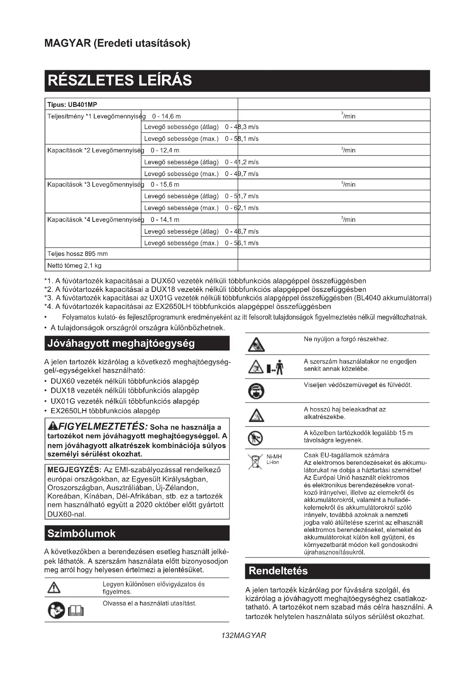 - EX2650LH többfunkciós alapgép FIGYELMEZTETÉS: Soha ne használja a tartozékot nem jóváhagyott meghajtóegységgel. A nem jóváhagyott alkatrészek kombinációja súlyos személyi sérülést okozhat. MEGJEGYZÉS:AzEMI-szabályozássalrendelkező európai országokban, az Egyesült Királyságban, Oroszországban, Ausztráliában, Új-Zélandon, Koreában, Kínában, Dél-Afrikában, stb. ez a tartozék nemhasználhatóegyütta2020októberelőttgyártott DUX60-nal. Szimbólumok Akövetkezőkbenaberendezésenesetleghasználtjelké- pekláthatók.Aszerszámhasználataelőttbizonyosodjon meg arról hogy helyesen értelmezi a jelentésüket. Legyenkülönösenelővigyázatosés gyelmes. Olvassa el a használati utasítást. Ne nyúljon a forgó részekhez. A szerszám használatakor ne engedjen senkit annak közelébe. Viseljenvédőszemüvegetésfülvédőt. A hosszú haj beleakadhat az alkatrészekbe. A közelben tartózkodók legalább 15 m távolságra legyenek. Ni-MH Li-ion Csak EU-tagállamok számára Az elektromos berendezéseket és akkumu- látorukat ne dobja a háztartási szemétbe! Az Európai Unió használt elektromos és elektronikus berendezésekre vonat- kozóirányelvei,illetveazelemekrőlés akkumulátorokról, valamint a hulladé- kelemekrőlésakkumulátorokrólszóló irányelv, továbbá azoknak a nemzeti jogba való átültetése szerint az elhasznált elektromos berendezéseket, elemeket és akkumulátorokatkülönkellgyűjteni,és környezetbarát módon kell gondoskodni újrahasznosításukról. Rendeltetés A jelen tartozék kizárólag por fúvására szolgál, és kizárólag a jóváhagyott meghajtóegységhez csatlakoz- tatható. A tartozékot nem szabad más célra használni. A tartozék helytelen használata súlyos sérülést okozhat.133 MAGYAR EK Megfelelőségi nyilatkozat Csak európai országokra vonatkozóan Mi, a: Makita Europe N.V., székhely: Jan-Baptist Vinkstraat 2 3070 Kortenberg BELGIUM. mint gyártó felhatalmazzuk Hiroshi Tsujimurá-taműszakileírás elkészítésére,valamintsajátfelelősségünkrekijelent- jük, hogy a termék(ek), úgy mint a: Rendeltetés: Fúvótartozék. Típusok rendeltetése: UB401MP. ) megfelelnek a 2006/42/EK és a 2000/14/EK irány- elvekkövetelményeinek,illetveakövetkezőharmo- nizált szabványok alapján kerültek legyártásra: EN 15503:2009+A1:2013+A2:2015, EN 50636-2-100:2014. A nyilatkozat helye és kelte: Kortenberg, Belgium. 29.