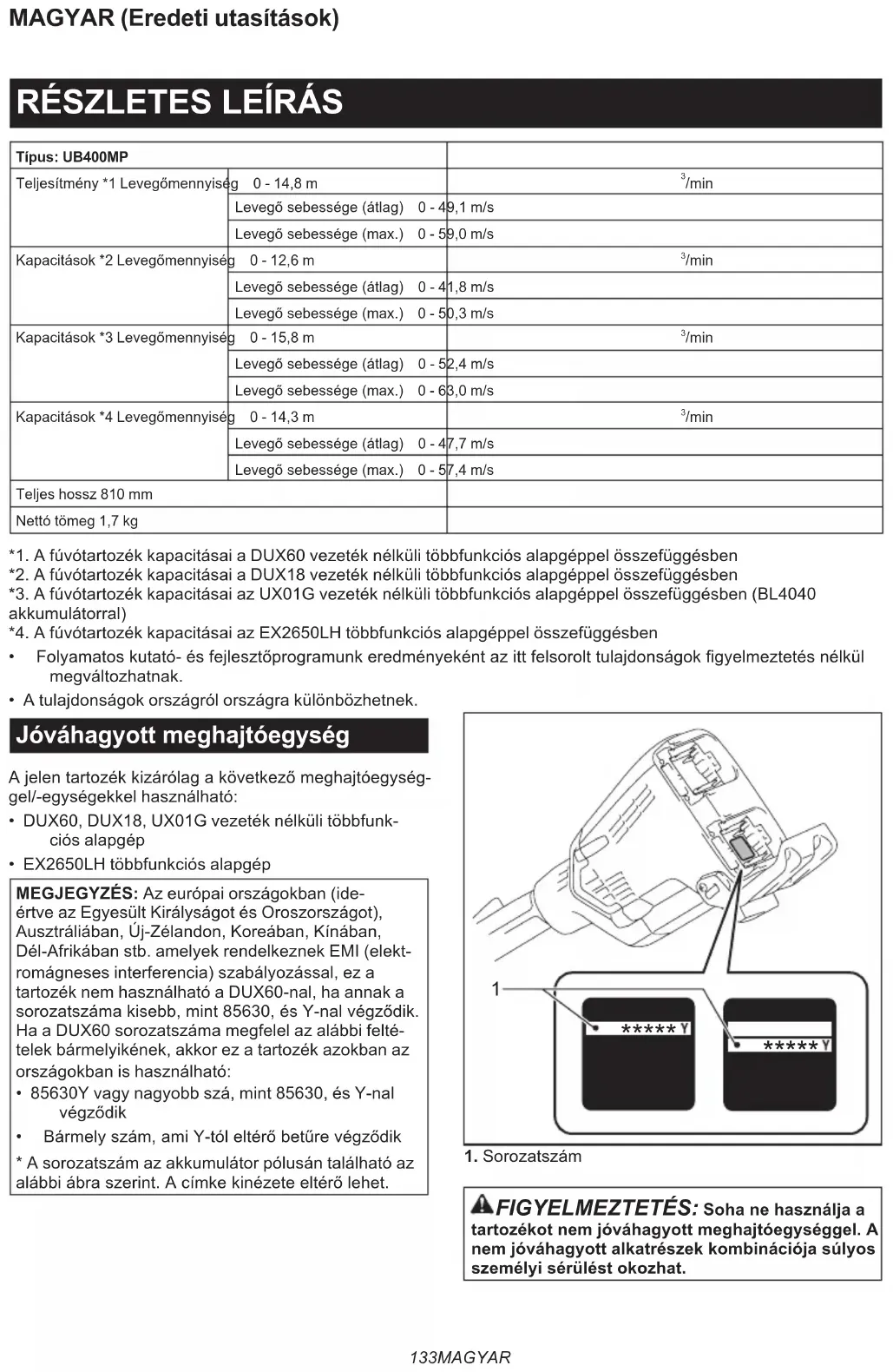 /min Levegősebessége(átlag) 0 - 47,7 m/sLevegősebessége(max.) 0 - 57,4 m/sTeljes hossz 810 mmNettó tömeg 1,7 kg*1. A fúvótartozék kapacitásai a DUX60 vezeték nélküli többfunkciós alapgéppel összefüggésben*2. A fúvótartozék kapacitásai a DUX18 vezeték nélküli többfunkciós alapgéppel összefüggésben*3. A fúvótartozék kapacitásai az UX01G vezeték nélküli többfunkciós alapgéppel összefüggésben (BL4040 akkumulátorral)*4. A fúvótartozék kapacitásai az EX2650LH többfunkciós alapgéppel összefüggésben• Folyamatoskutató-ésfejlesztőprogramunkeredményekéntazittfelsorolttulajdonságokgyelmeztetésnélkülmegváltozhatnak.• A tulajdonságok országról országra különbözhetnek. Jóváhagyott meghajtóegység Ajelentartozékkizárólagakövetkezőmeghajtóegység-gel/-egységekkel használható:• DUX60, DUX18, UX01G vezeték nélküli többfunk-ciós alapgép• EX2650LH többfunkciós alapgépMEGJEGYZÉS: Az európai országokban (ide-értve az Egyesült Királyságot és Oroszországot), Ausztráliában, Új-Zélandon, Koreában, Kínában, Dél-Afrikában stb. amelyek rendelkeznek EMI (elekt-romágneses interferencia) szabályozással, ez a tartozék nem használható a DUX60-nal, ha annak a sorozatszámakisebb,mint85630,ésY-nalvégződik.Ha a DUX60 sorozatszáma megfelel az alábbi felté-telek bármelyikének, akkor ez a tartozék azokban az országokban is használható:• 85630Y vagy nagyobb szá, mint 85630, és Y-nal végződik• Bármelyszám,amiY-tóleltérőbetűrevégződik* A sorozatszám az akkumulátor pólusán található az alábbiábraszerint.Acímkekinézeteeltérőlehet.