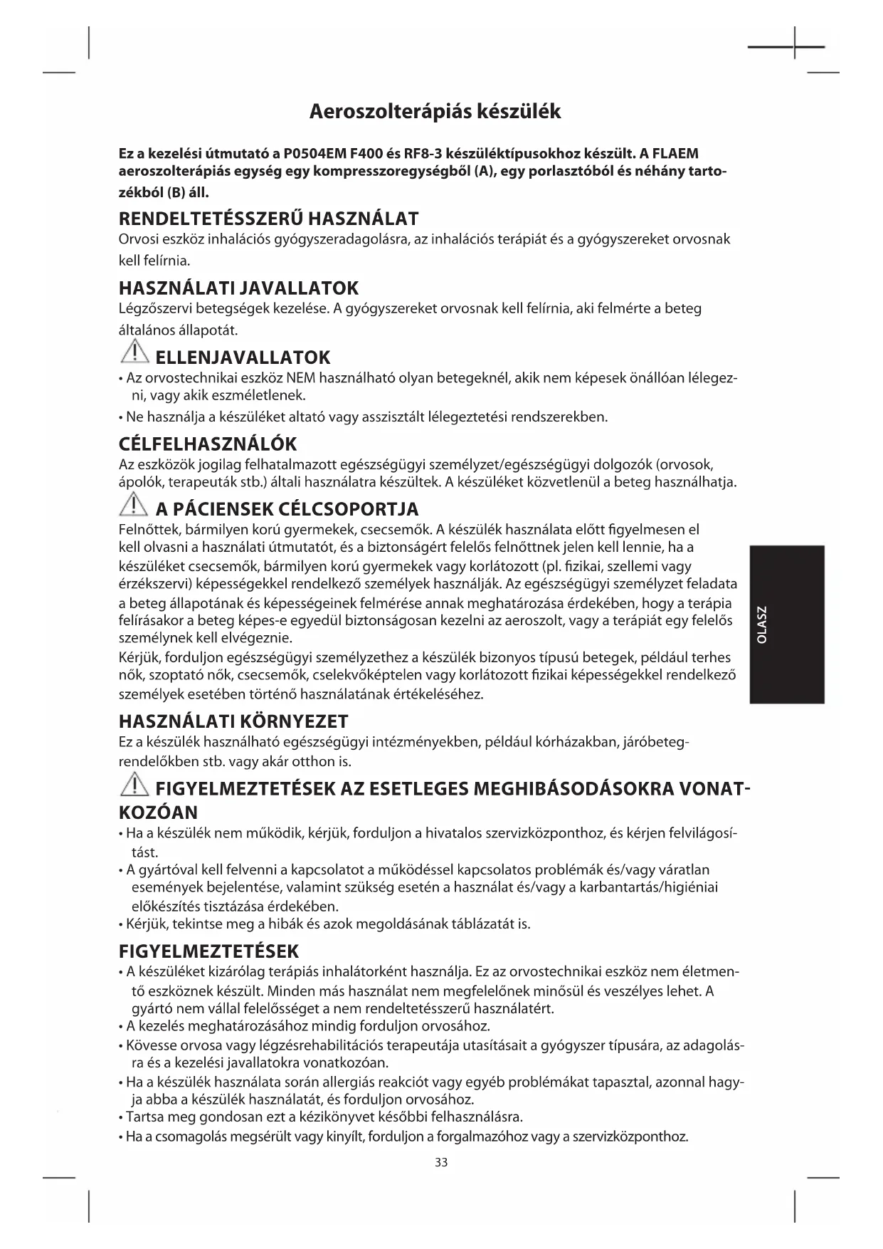 A készülék szívószűrővel (A3) van felszerelve, amelyet ki kell cserélni, ha szennyezett vagy megváltozik a színe. Ne mossa és ne használja újra ugyanazt a szűrőt. A szűrő rendszeres cseréje szükséges a kompresszoregység megfelelő teljesítményének biztosításához. A szűrőt rendszeresen ellenőrizni kell. A szűrők cseréjéért forduljon a kereskedőhöz vagy a hivatalos szervizközponthoz. A szűrő cseréjéhez húzza ki azt az ábrán látható módon. A szűrő úgy készült, hogy mindig a házában legyen rögzítve. Ne cserélje a szűrőt használat közben. Csak eredeti Flaem tartozékokat vagy cserealkatrészeket használjon, nem eredeti alkatrészek vagy tartozékok használata esetén felelősséget nem vállalunk. 42Aerosol therapy device These user instructions are provided for P0504EM F400 and RF8-3 model devices. The FLAEM Aerosol Therapy device consists of a compressor unit (A), a nebuliser and some accessories (B). INTENDED USE Medical device for the administration of medication through inhalation, with inhalation therapy and medication prescribed by a Doctor.