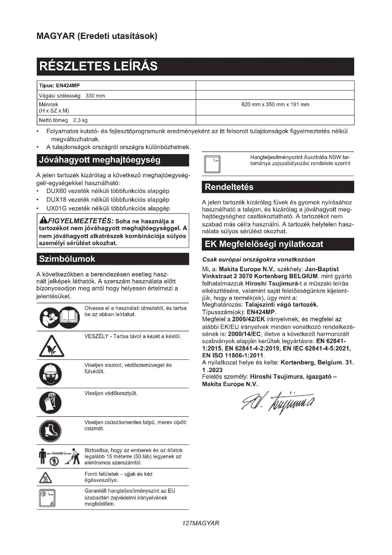 - UX01Gvezetéknélkülitöbbfunkciósalapgép FIGYELMEZTETÉS: Soha ne használja a tartozékot nem jóváhagyott meghajtóegységgel. A nem jóváhagyott alkatrészek kombinációja súlyos személyi sérülést okozhat. Szimbólumok Akövetkezőkbenaberendezésenesetleghasz- náltjelképekláthatók.Aszerszámhasználataelőtt bizonyosodjonmegarrólhogyhelyesenértelmezia jelentésüket. Olvassaelahasználatiútmutatót,éstartsa beazabbanleírtakat. VESZÉLY-Tartsatávolakezétakéstől. Viseljensisakot,védőszemüvegetés fülvédőt. Viseljenvédőkesztyűt. Viseljencsúszásmentestalpú,merevcipőt/ csizmát. Biztosítsa,hogyazemberekésazállatok legalább15méterre(50láb)legyenekaz elektromosszerszámtól. Forrófelületek–ujjakéskéz égésveszélye. GarantálthangteljesítményszintazEU szabadtérizajvédelmiirányelvének megfelelően. HangteljesítményszintAusztráliaNSWtar- tományazajszabályozásirendeleteszerint Rendeltetés Ajelentartozékkizárólagfüvekésgyomoknyírásához használhatóatalajon,éskizárólagajóváhagyottmeg- hajtóegységhezcsatlakoztatható.Atartozékotnem szabadmáscélrahasználni.Atartozékhelytelenhasz- nálatasúlyossérüléstokozhat. EK Megfelelőségi nyilatkozat Csak európai országokra vonatkozóan Mi, a: Makita Europe N.V.,székhely:Jan-Baptist Vinkstraat 2 3070 Kortenberg BELGIUM.mintgyártó felhatalmazzuk Hiroshi Tsujimurá-taműszakileírás elkészítésére,valamintsajátfelelősségünkrekijelent- jük,hogyatermék(ek),úgyminta: Meghatározás:Talajszinti vágó tartozék. Típusszám(ok):EN424MP. Megfelel a 2006/42/EKirányelvnek,ésmegfelelaz alábbiEK/EUirányelvekmindenvonatkozórendelkezé- sének is: 2000/14/EC,illetveakövetkezőharmonizált szabványokalapjánkerülteklegyártásra:EN 62841- 1:2015, EN 62841-4-2:2019, EN IEC 62841-4-5:2021, EN ISO 11806-1:2011. Anyilatkozathelyeéskelte:Kortenberg, Belgium. 31.