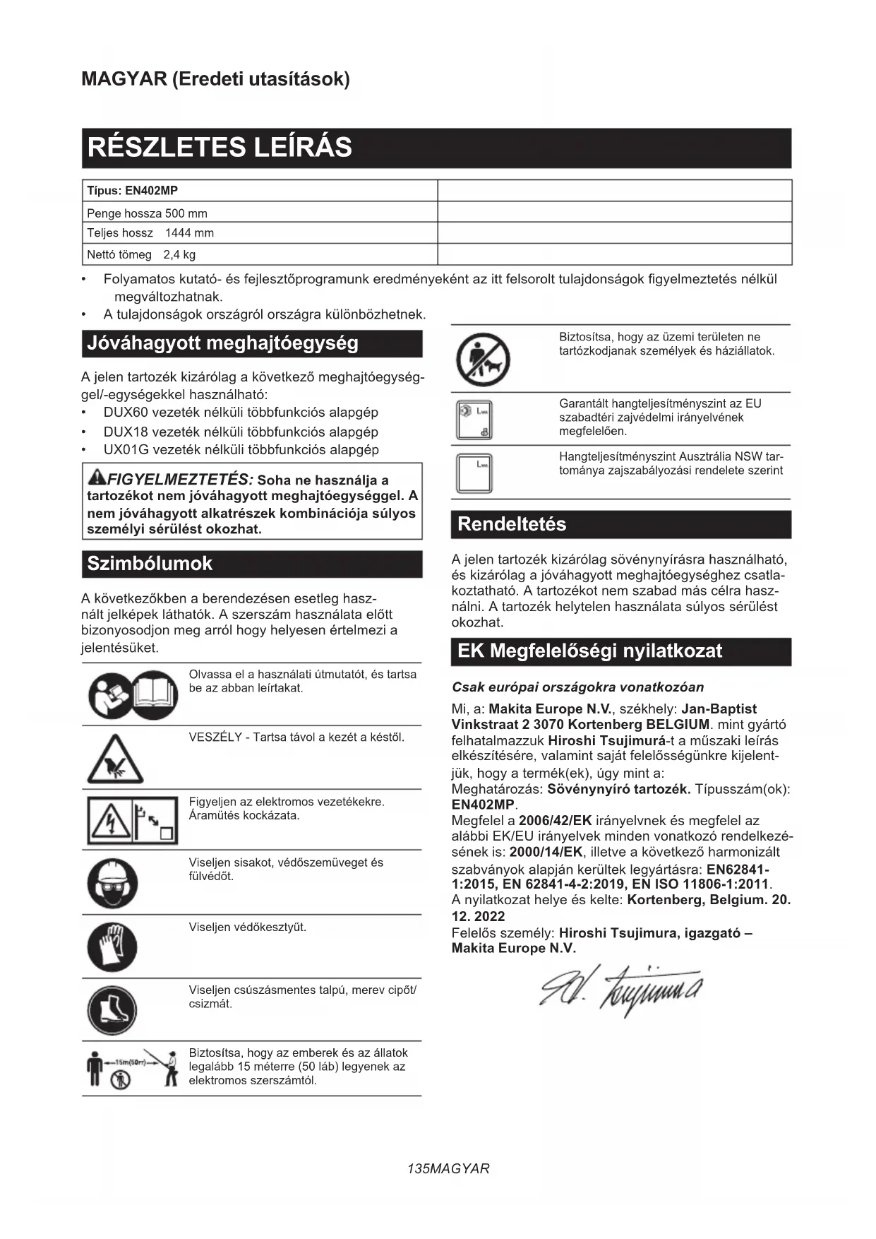 - UX01Gvezetéknélkülitöbbfunkciósalapgép FIGYELMEZTETÉS: Soha ne használja a tartozékot nem jóváhagyott meghajtóegységgel. A nem jóváhagyott alkatrészek kombinációja súlyos személyi sérülést okozhat. Szimbólumok Akövetkezőkbenaberendezésenesetleghasz- náltjelképekláthatók.Aszerszámhasználataelőtt bizonyosodjonmegarrólhogyhelyesenértelmezia jelentésüket. Olvassaelahasználatiútmutatót,éstartsa beazabbanleírtakat. VESZÉLY-Tartsatávolakezétakéstől. Figyeljenazelektromosvezetékekre. Áramütéskockázata. Viseljensisakot,védőszemüvegetés fülvédőt. Viseljenvédőkesztyűt. Viseljencsúszásmentestalpú,merevcipőt/ csizmát. Biztosítsa,hogyazemberekésazállatok legalább15méterre(50láb)legyenekaz elektromosszerszámtól. Biztosítsa,hogyazüzemiterületenne tartózkodjanakszemélyekésháziállatok. GarantálthangteljesítményszintazEU szabadtérizajvédelmiirányelvének megfelelően. HangteljesítményszintAusztráliaNSWtar- tományazajszabályozásirendeleteszerint Rendeltetés Ajelentartozékkizárólagsövénynyírásrahasználható, éskizárólagajóváhagyottmeghajtóegységhezcsatla- koztatható.Atartozékotnemszabadmáscélrahasz- nálni.Atartozékhelytelenhasználatasúlyossérülést okozhat. EK Megfelelőségi nyilatkozat Csak európai országokra vonatkozóan Mi, a: Makita Europe N.V.,székhely:Jan-Baptist Vinkstraat 2 3070 Kortenberg BELGIUM.mintgyártó felhatalmazzuk Hiroshi Tsujimurá-taműszakileírás elkészítésére,valamintsajátfelelősségünkrekijelent- jük,hogyatermék(ek),úgyminta: Meghatározás:Sövénynyíró tartozék.Típusszám(ok): EN402MP. Megfelel a 2006/42/EKirányelvnekésmegfelelaz alábbiEK/EUirányelvekmindenvonatkozórendelkezé- sének is: 2000/14/EK,illetveakövetkezőharmonizált szabványokalapjánkerülteklegyártásra:EN62841- 1:2015, EN 62841-4-2:2019, EN ISO 11806-1:2011. Anyilatkozathelyeéskelte:Kortenberg, Belgium. 20.
