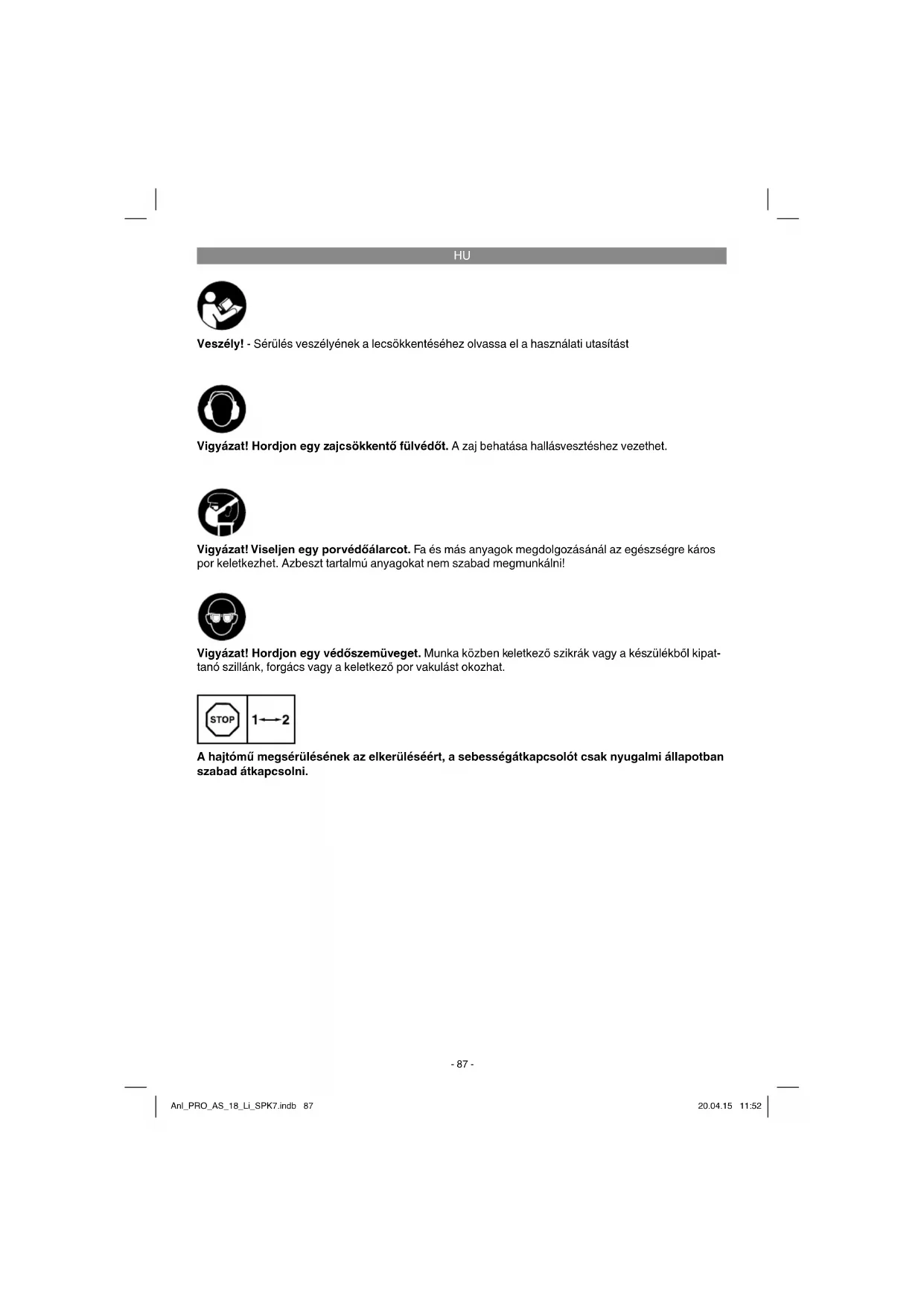 Veszély! - Sérülés veszélyének a lecsökkentéséhez olvassa el a használati utasítást Vigyázat! Hordjon egy zajcsökkentő fülvédőt. A zaj behatása hallásvesztéshez vezethet. Vigyázat! Hordjon egy védőszemüveget. Munka közben keletkező szikrák vagy a készülékből kipat- tanó szillánk, forgács vagy a keletkező por vakulást okozhat. Vigyázat! Viseljen egy porvédőálarcot. Fa és más anyagok megdolgozásánál az egészségre káros por keletkezhet. Azbeszt tartalmú anyagokat nem szabad megmunkálni! A hajtómű megsérülésének az elkerüléséért, a sebességátkapcsolót csak nyugalmi állapotban szabad átkapcsolni. Anl_PRO_AS_18_Li_SPK7.indb 87Anl_PRO_AS_18_Li_SPK7.indb 87 20.04.15 11:5220.04.15 11:52HU