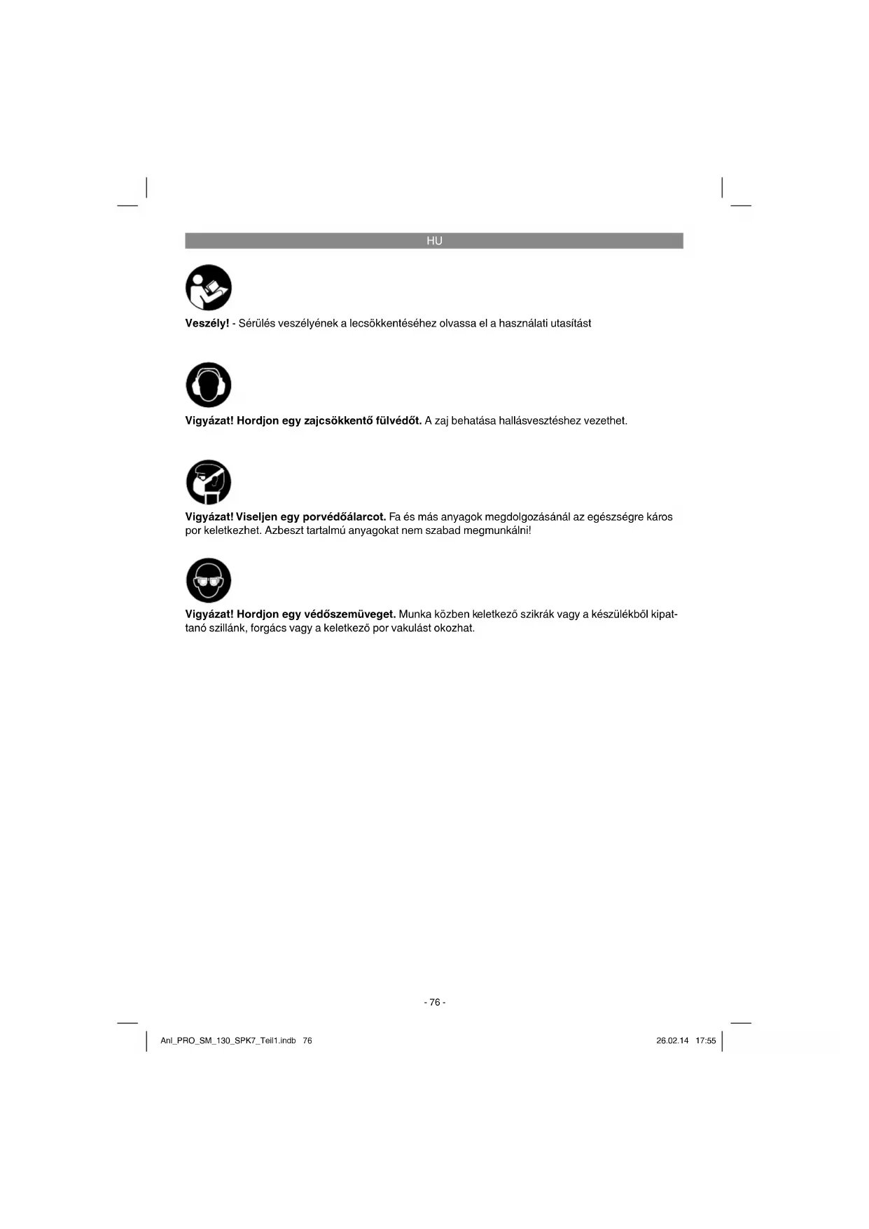 Veszély! - Sérülés veszélyének a lecsökkentéséhez olvassa el a használati utasítást Vigyázat! Hordjon egy zajcsökkentő fülvédőt. A zaj behatása hallásvesztéshez vezethet. Vigyázat! Hordjon egy védőszemüveget. Munka közben keletkező szikrák vagy a készülékből kipat- tanó szillánk, forgács vagy a keletkező por vakulást okozhat. Vigyázat! Viseljen egy porvédőálarcot. Fa és más anyagok megdolgozásánál az egészségre káros por keletkezhet. Azbeszt tartalmú anyagokat nem szabad megmunkálni! Anl_PRO_SM_130_SPK7_Teil1.indb 76Anl_PRO_SM_130_SPK7_Teil1.indb 76 26.02.14 17:5526.02.14 17:55HU