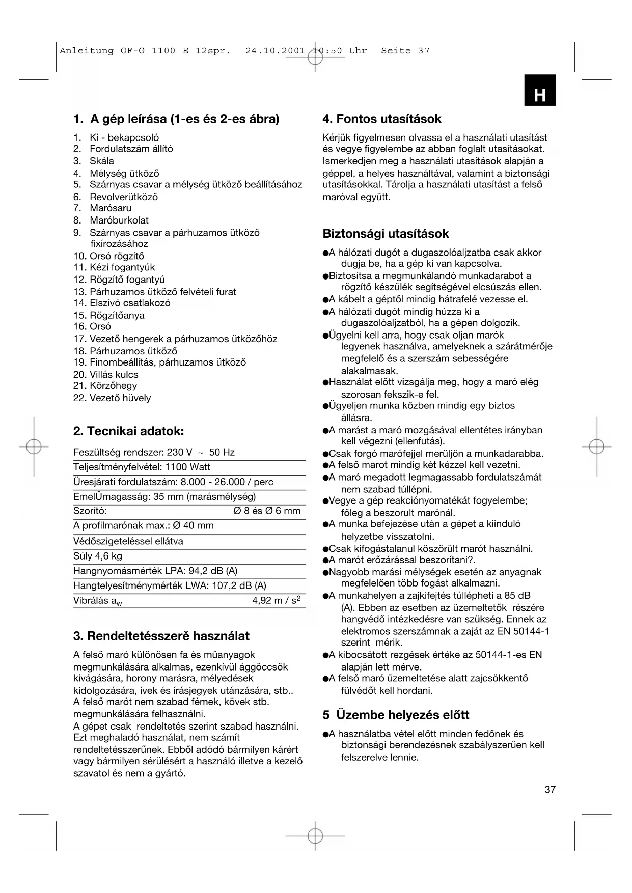 Anleitung OF-G 1100 E 12spr. 24.10.2001 10:50 Uhr Seite 37 Mielőtt a gépet az elektromos hálózatra csatlakoztatja ellenőrizze le, hogy a gép tipustábláján levő adatok a hálózati adatokkal megegyeznek e.