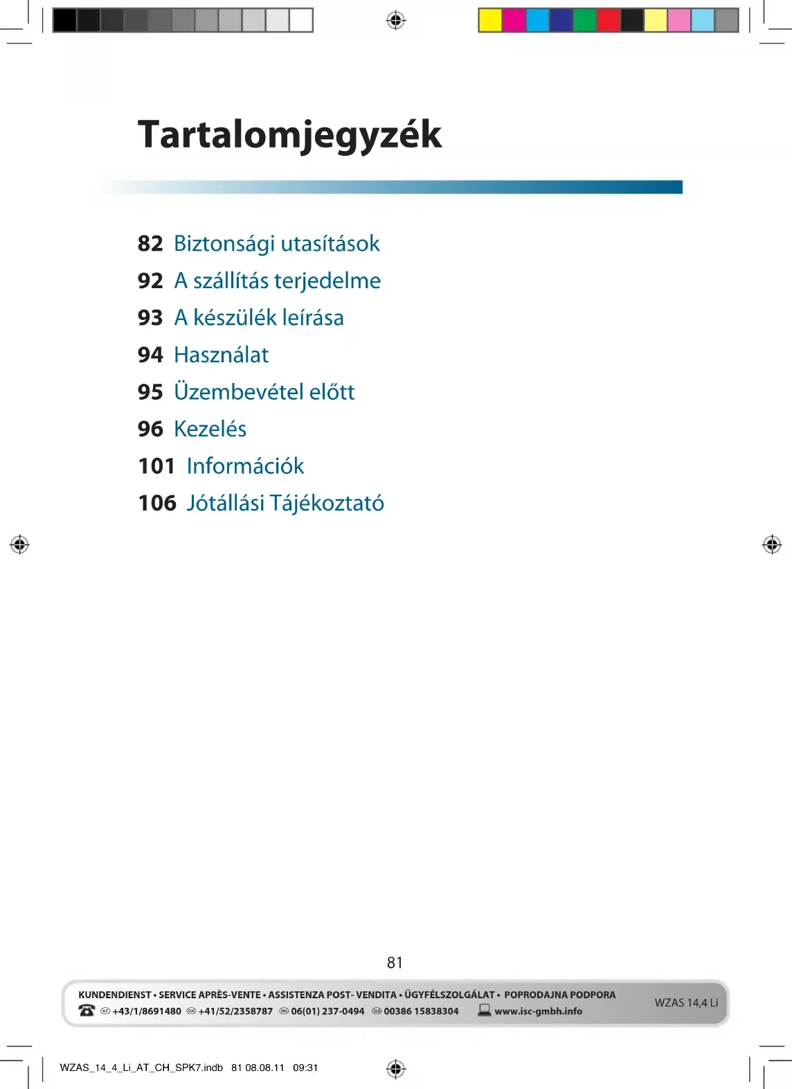 KUNDENDIENST • SERVICE APRÈS-VENTE • ASSISTENZA POST- VENDITA • ÜGYFÉLSZOLGÁLAT • POPRODAJNA PODPORA www.isc-gmbh.info WZAS 14,4 Li Tartalomjegyzék 82 Biztonsági utasítások 92 A szállítás terjedelme 93 A készülék leírása 94 Használat 95 Üzembevétel előtt 96 Kezelés 101 Információk 106 Jótállási Tájékoztató WZAS_14_4_Li_AT_CH_SPK7.indb 81 08.08.11 09:3182