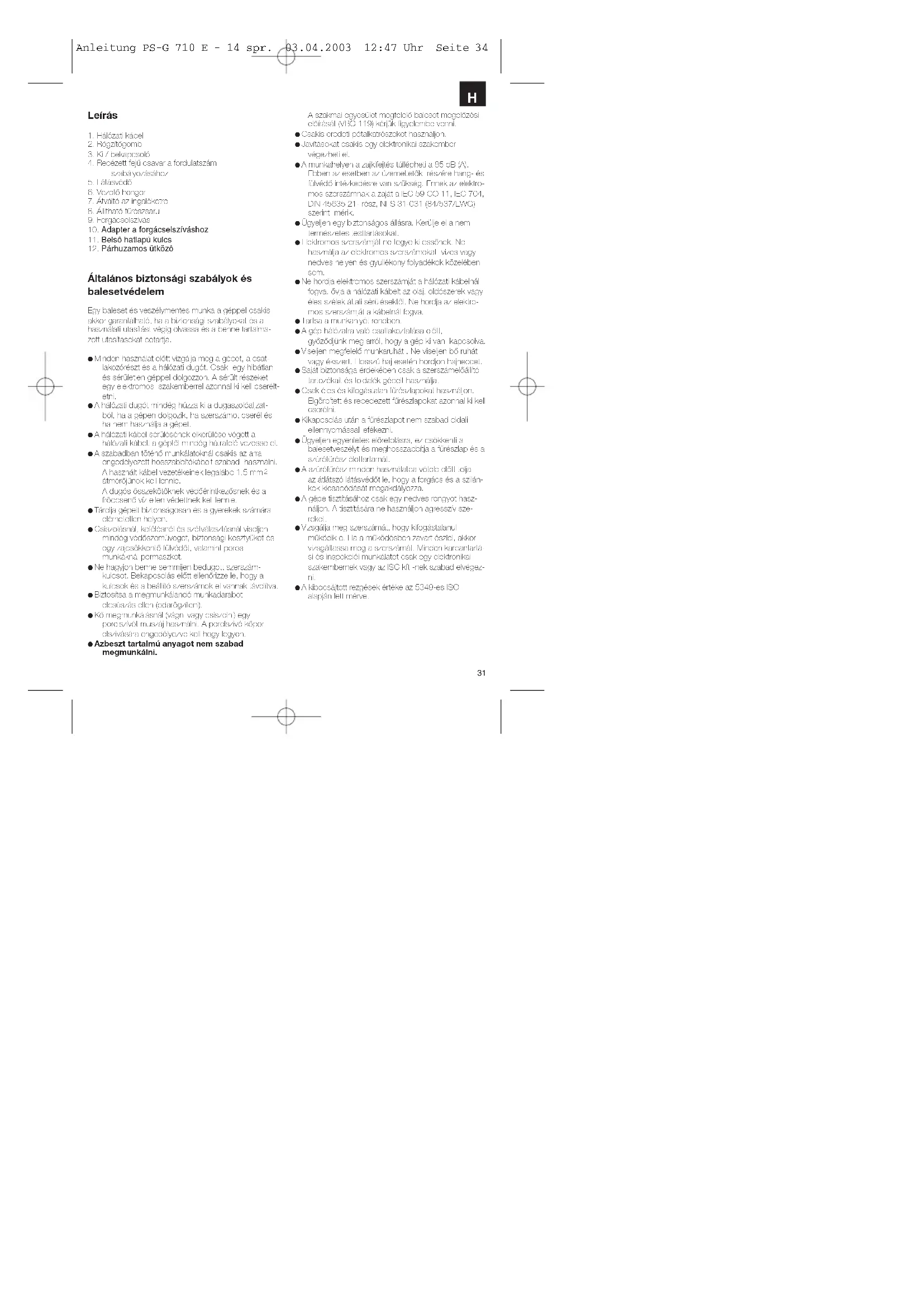 átmérőjűnek kell lennie. A dugós összekötőknek védőérintkezősnek és a fröccsenő víz ellen védettnek kell lennie. Tárolja gépeit biztonságosan és a gyerekek számára elérhetetlen helyen. Csiszolásnál, kefélésnél és szétválasztásnál viseljen mindég védőszemüveget, biztonsági kesztyűket és egy zajcsökkentő fülvédőt, valamint poros munkáknál pormaszkot. Ne hagyjon benne semmijen bedugott szerszám- kulcsot. Bekapcsolás előtt ellenőrizze le, hogy a kulcsok és a beállító szerszámok el vannak távolítva. Biztosítsa a megmunkálandó munkadarabot elcsúszás ellen (odarögzíteni). Kő megmunkálásnál (vágni vagy csiszolni) egy porelszívót muszáj használni. A porelszivó kőpor elszivására engedélyezve kell hogy legyen. Azbeszt tartalmú anyagot nem szabad megmunkálni. A szakmai egyesület megfelelő baleset megelőzési előírását (VBG 119) kérjük figyelembe venni. Csakis eredeti pótalkatrészeket használjon. Javításokat csakis egy elektronikai szakember végezheti el. A munkahelyen a zajkifejtés túllépheti a 85 dB (A). Ebben az esetben az üzemeltetők részére hang- és fülvédő intézkedésre van szükség. Ennek az elektro- mos szerszámnak a zaját a IEC 59 CO 11, IEC 704, DIN 45635 21- rész, NFS 31-031 (84/537/EWG) szerint mérik. Ügyeljen egy biztonságos állásra. Kerülje el a nem természetes testtartásokat. Elektromos szerszámját ne tegye ki essőnek. Ne használja az elektromos szerszámokat vizes vagy nedves helyen és gyullékony folyadékok közelében sem. Ne hordja elektromos szerszámját a hálózati kábelnál fogva. ővja a hálózati kábelt az olaj, oldószerek vagy éles szélek általi sérülésektől. Ne hordja az elektro- mos szerszámját a kábelnál fogva. Tartsa a munkahlyét rendben. A gép hálózatra való csatlakoztatása előtt, győződjünk meg arról, hogy a gép ki van kapcsolva. Viseljen megfelelő munkaruhát . Ne viseljen bő ruhát vagy ékszert. Hosszú haj esetén hordjon hajneccet. Saját biztonsága érdekében csak a szerszámelőállító tartozékait és toldalék gépeit használja. Csak éles és kifogástalan fűrészlapokat használjon. Elgörbített és repedezett fűrészlapokat azonnal ki kell cserélni. Kikapcsolás után a fűrészlapot nem szabad oldali ellennyomással lefékezni. Ügyeljen egyenletes előretolásra, ez csökkenti a balesetveszélyt és meghosszabbítja a fűrészlap és a szúrófűrész élettartamát. A szúrófűrész minden használatba vétele előtt tolja az átlátszó látásvédőt le, hogy a forgács és a szilán- kok kicsapódását megakdályozza. A gépe tisztításához csak egy nedves rongyot hasz- náljon. A tisztítására ne használjon agresszív sze- reket. Vizsgálja meg szerszámát, hogy kifogástalanul működik e. Ha a működésben zavart észlel, akkor vizsgáltassa meg a szerszámát. Minden karbantartá- si és inspekciói munkálatot csak egy elektronikai szakembernek vagy az ISC kft -nek szabad elvégez- ni. A kibocsájtott rezgések értéke az 5349-es ISO alapján lett mérve. Anleitung PS-G 710 E - 14 spr. 03.04.2003 12:47 Uhr Seite 34ALKALMAZÁS A szúrófűrész a megfelelő fűrészlap használatával fa, vas, színesfém és műanyagok fűrészelésére van előrelátva. A látásvédő felszerelése Tolja a látásvédőt az 1- ábra szerint a gépre és csavaro- zza a mellékelt csavarokkal a látásvédőt erőssen oda.