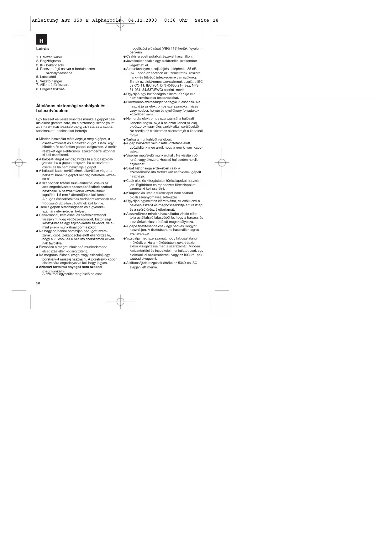 átmérőjűnek kell lennie. A dugós összekötőknek védőérintkezősnek és a fröccsenő víz ellen védettnek kell lennie. Tárolja gépeit biztonságosan és a gyerekek számára elérhetetlen helyen. Csiszolásnál, kefélésnél és szétválasztásnál viseljen mindég védőszemüveget, biztonsági kesztyűket és egy zajcsökkentő fülvédőt, vala- mint poros munkáknál pormaszkot. Ne hagyjon benne semmijen bedugott szers- zámkulcsot. Bekapcsolás előtt ellenőrizze le, hogy a kulcsok és a beállító szerszámok el van- nak távolítva. Biztosítsa a megmunkálandó munkadarabot elcsúszás ellen (odarögzíteni). Kő megmunkálásnál (vágni vagy csiszolni) egy porelszívót muszáj használni. A porelszivó kőpor elszivására engedélyezve kell hogy legyen. Azbeszt tartalmú anyagot nem szabad megmunkálni. A szakmai egyesület megfelelő baleset megelőzési előírását (VBG 119) kérjük figyelem- be venni. Csakis eredeti pótalkatrészeket használjon. Javításokat csakis egy elektronikai szakember végezheti el. A munkahelyen a zajkifejtés túllépheti a 85 dB (A). Ebben az esetben az üzemeltetők részére hang- és fülvédő intézkedésre van szükség. Ennek az elektromos szerszámnak a zaját a IEC 59 CO 11, IEC 704, DIN 45635 21- rész, NFS 31-031 (84/537/EWG) szerint mérik. Ügyeljen egy biztonságos állásra. Kerülje el a nem természetes testtartásokat. Elektromos szerszámját ne tegye ki essőnek. Ne használja az elektromos szerszámokat vizes vagy nedves helyen és gyullékony folyadékok közelében sem. Ne hordja elektromos szerszámját a hálózati kábelnál fogva. ővja a hálózati kábelt az olaj, oldószerek vagy éles szélek általi sérülésektől. Ne hordja az elektromos szerszámját a kábelnál fogva. Tartsa a munkahlyét rendben. A gép hálózatra való csatlakoztatása előtt, győződjünk meg arról, hogy a gép ki van kapc- solva. Viseljen megfelelő munkaruhát . Ne viseljen bő ruhát vagy ékszert. Hosszú haj esetén hordjon hajneccet. Saját biztonsága érdekében csak a szerszámelőállító tartozékait és toldalék gépeit használja. Csak éles és kifogástalan fűrészlapokat használ- jon. Elgörbített és repedezett fűrészlapokat azonnal ki kell cserélni. Kikapcsolás után a fűrészlapot nem szabad oldali ellennyomással lefékezni. Ügyeljen egyenletes előretolásra, ez csökkenti a balesetveszélyt és meghosszabbítja a fűrészlap és a szúrófűrész élettartamát. A szúrófűrész minden használatba vétele előtt tolja az átlátszó látásvédőt le, hogy a forgács és a szilánkok kicsapódását megakdályozza. A gépe tisztításához csak egy nedves rongyot használjon. A tisztítására ne használjon agres- szív szereket. Vizsgálja meg szerszámát, hogy kifogástalanul működik e. Ha a működésben zavart észlel, akkor vizsgáltassa meg a szerszámát. Minden karbantartási és inspekciói munkálatot csak egy elektronikai szakembernek vagy az ISC kft -nek szabad elvégezni. A kibocsájtott rezgések értéke az 5349-es ISO alapján lett mérve. Anleitung AST 350 E AlphaTools 04.12.2003 8:36 Uhr Seite 28Használati utasítás elektromos szúrófűrészhez ALKALMAZÁS A szúrófűrész a megfelelő fűrészlap használatával fa, vas, színesfém és műanyagok fűrészelésére van előrelátva.
