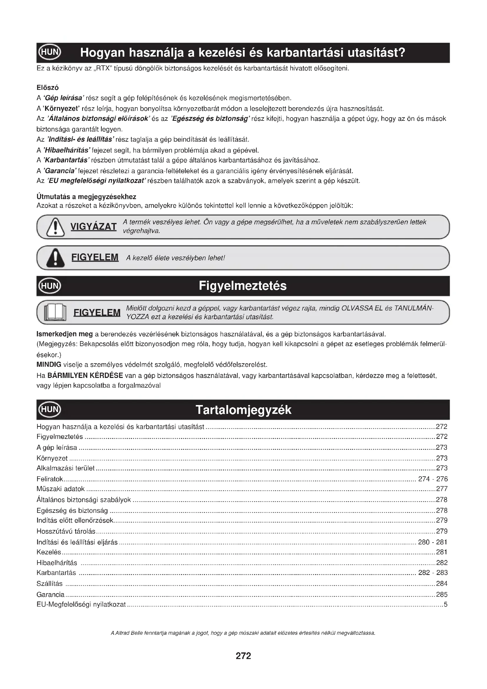 - UTILIZAğI SILICONE RO272 Hogyan használja a kezelési és karbantartási utasítást? HUN Ez a kézikönyv az „RTX” típusú döngölĘk biztonságos kezelését és karbantartását hivatott elĘsegíteni. ElĘszó A ‘Gép leírása’ rész segít a gép felépítésének és kezelésének megismertetésében. A ’Környezet’ rész leírja, hogyan bonyolítsa környezetbarát módon a leselejtezett berendezés újra hasznosítását. Az ’Általános biztonsági elĘírások’ és az ’Egészség és biztonság’ rész kifejti, hogyan használja a gépet úgy, hogy az ön és mások biztonsága garantált legyen. Az ’Indítási- és leállítás’ rész taglalja a gép beindítását és leállítását. A ’Hibaelhárítás’ fejezet segít, ha bármilyen problémája akad a gépével. A ’Karbantartás’ részben útmutatást talál a gépe általános karbantartásához és javításához. A ’Garancia’ fejezet részletezi a garancia-feltételeket és a garanciális igény érvényesítésének eljárását. Az ’EU megfelelĘségi nyilatkozat’ részben találhatók azok a szabványok, amelyek szerint a gép készült. Útmutatás a megjegyzésekhez Azokat a részeket a kézikönyvben, amelyekre különös tekintettel kell lennie a következĘképpen jelöltük: MielĘtt dolgozni kezd a géppel, vagy karbantartást végez rajta, mindig OLVASSA EL és TANULMÁN- YOZZA ezt a kezelési és karbantartási utasítást. FIGYELEM A termék veszélyes lehet. Ön vagy a gépe megsérülhet, ha a mĦveletek nem szabályszerĦen lettek végrehajtva. VIGYÁZAT A kezelĘ élete veszélyben lehet! FIGYELEM Figyelmeztetés HUN Tartalomjegyzék Ismerkedjen meg a berendezés vezérlésének biztonságos használatával, és a gép biztonságos karbantartásával. (Megjegyzés: Bekapcsolás elĘtt bizonyosodjon meg róla, hogy tudja, hogyan kell kikapcsolni a gépet az esetleges problémák felmerül- ésekor.) MINDIG viselje a személyes védelmét szolgáló, megfelelĘ védĘfelszerelést. Ha BÁRMILYEN KÉRDÉSE van a gép biztonságos használatával, vagy karbantartásával kapcsolatban, kérdezze meg a felettesét, vagy lépjen kapcsolatba a forgalmazóval HUN Hogyan használja a kezelési és karbantartási utasítást p. 272