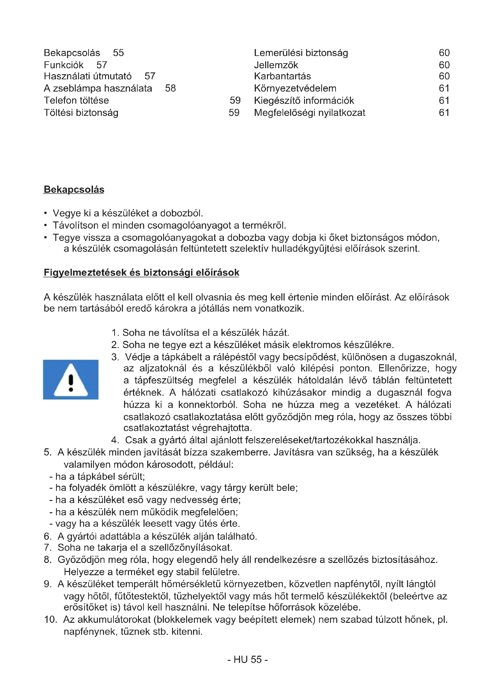 napfénynek, tűznek b. kitenni. Bekapcsolás 55 Funkciók 57 Használatiútmutató 57 Azseblámpahasználata 58 Telefon töltése 59 Töltésibiztonság 59 Lemerülésibiztonság 60 Jellemzők 60 Karbantartás 60 Környezetvédelem 61 Kiegészítőinformációk 61 Megfelelőséginyilatkozat 61- HU 56 -