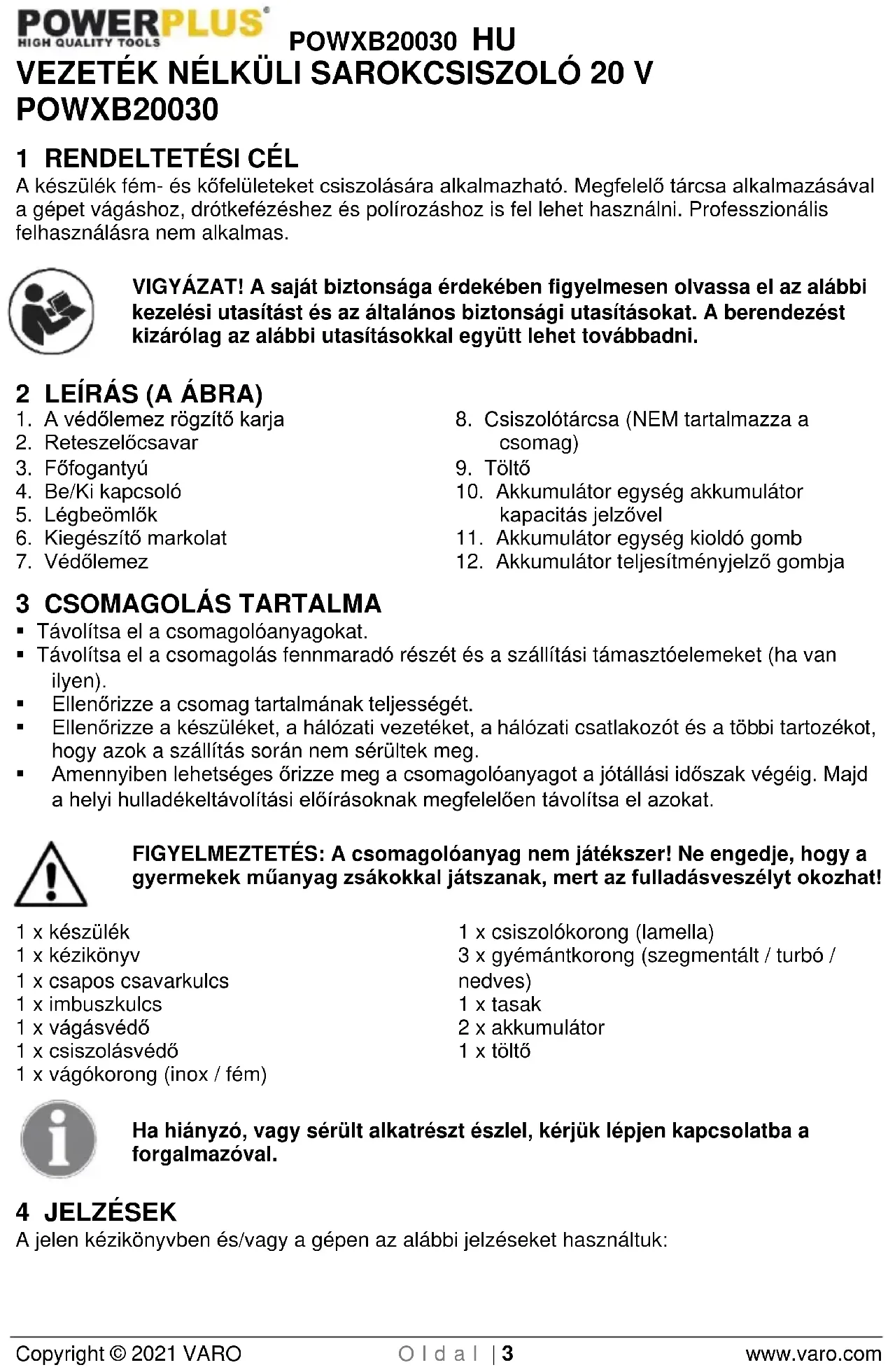 - Amennyiben lehetséges őrizze meg a csomagolóanyagot a jótállási időszak végéig. Majd a helyi hulladékeltávolítási előírásoknak megfelelően távolítsa el azokat. FIGYELMEZTETÉS: A csomagolóanyag nem játékszer! Ne engedje, hogy a gyermekek műanyag zsákokkal játszanak, mert az fulladásveszélyt okozhat! 1 x készülék 1 x kézikönyv 1 x csapos csavarkulcs 1 x imbuszkulcs 1 x vágásvédő 1 x csiszolásvédő 1 x vágókorong (inox / fém) 1 x csiszolókorong (lamella) 3 x gyémántkorong (szegmentált / turbó / nedves) 1 x tasak 2 x akkumulátor 1 x töltő Ha hiányzó, vagy sérült alkatrészt észlel, kérjük lépjen kapcsolatba a forgalmazóval. 4 JELZÉSEK A jelen kézikönyvben és/vagy a gépen az alábbi jelzéseket használtuk:POWXB20030 HU Copyright © 2021 VARO O l d a l | 4 www.varo.com
