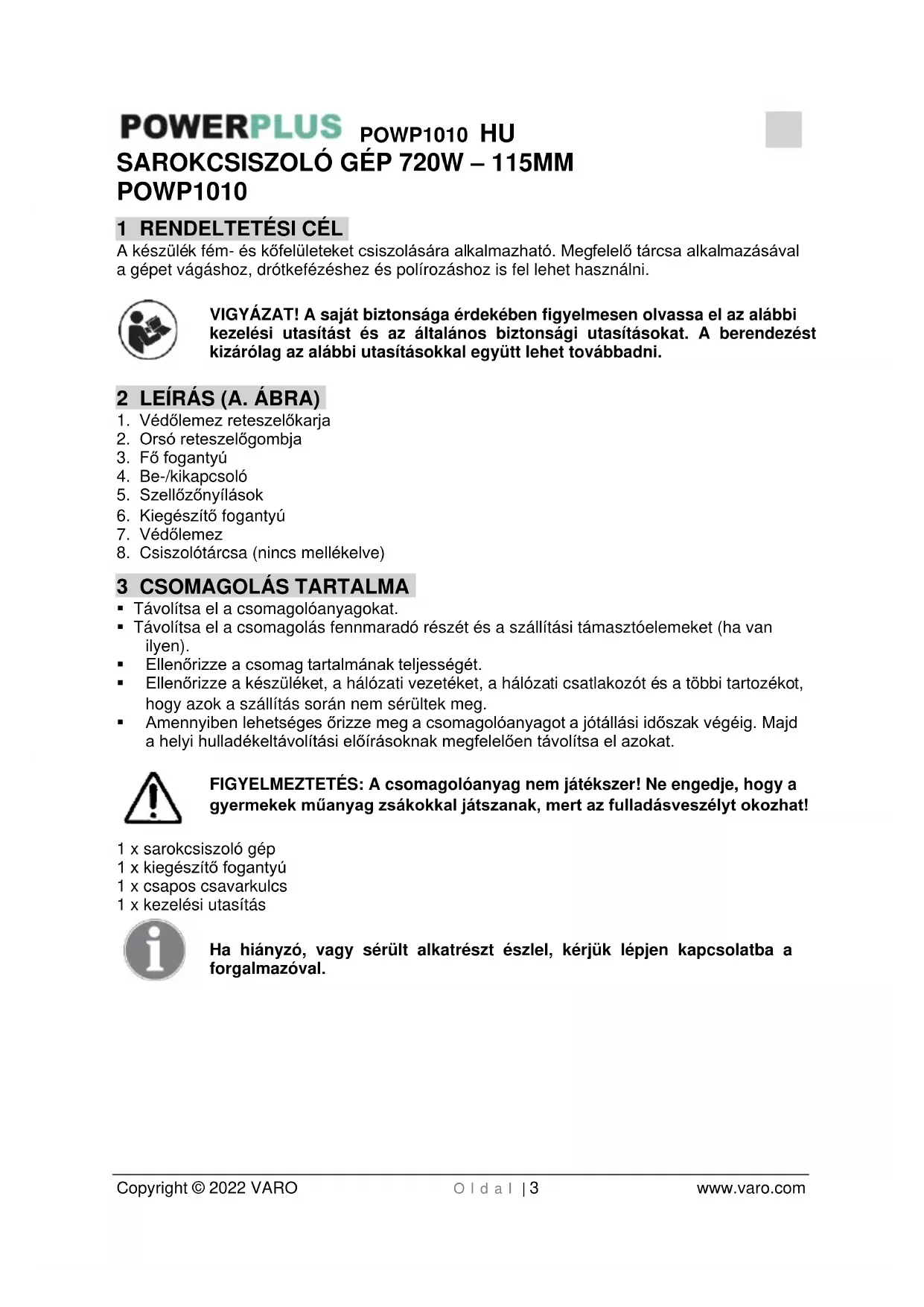 - Azok az eszközök és alkatrészek, melyek a jótállás keretében kerülnek kicserélésre, a Varo NV tulajdonát képezik.POWP1010 HU Copyright © 2022 VARO O l d a l | 11 www.varo.com