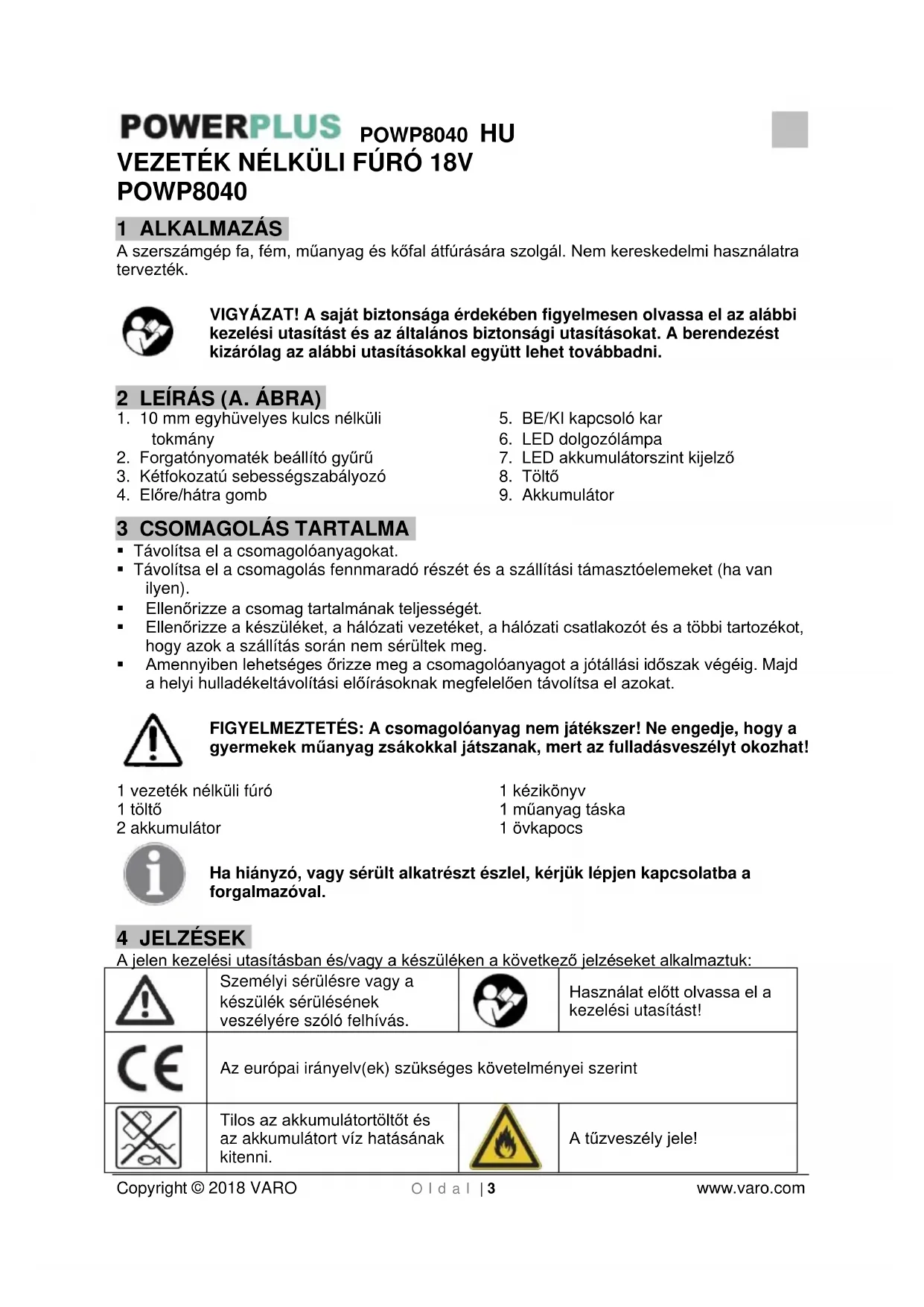 A tűzveszély jele!POWP8040 HU Copyright © 2018 VARO O l d a l | 4 www.varo.com