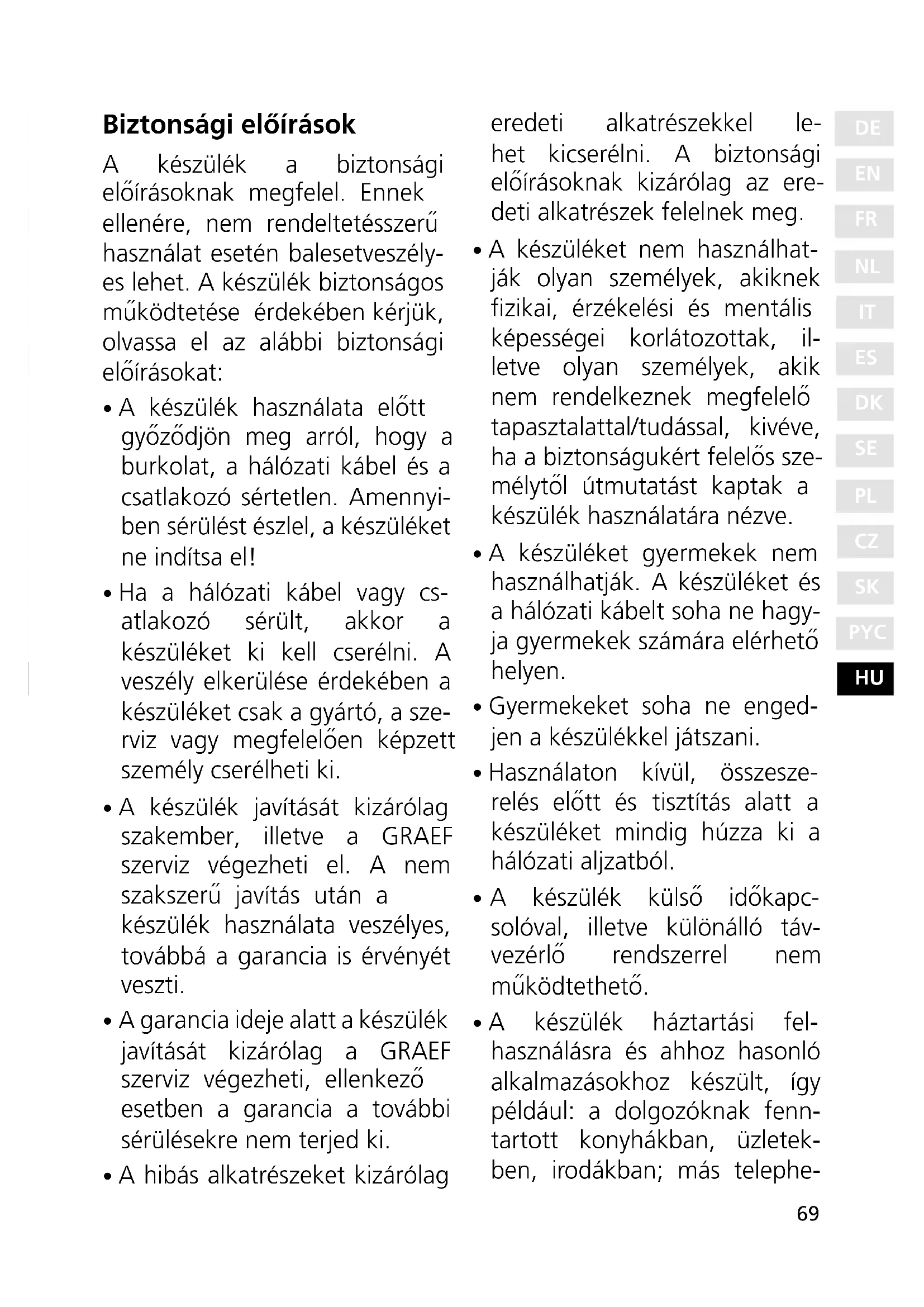 - A készülék javítását kizárólag szakember, illetve a GRAEF szerviz végezheti el. A nem szakszerű javítás után a készülék használata veszélyes, továbbá a garancia is érvényét veszti.