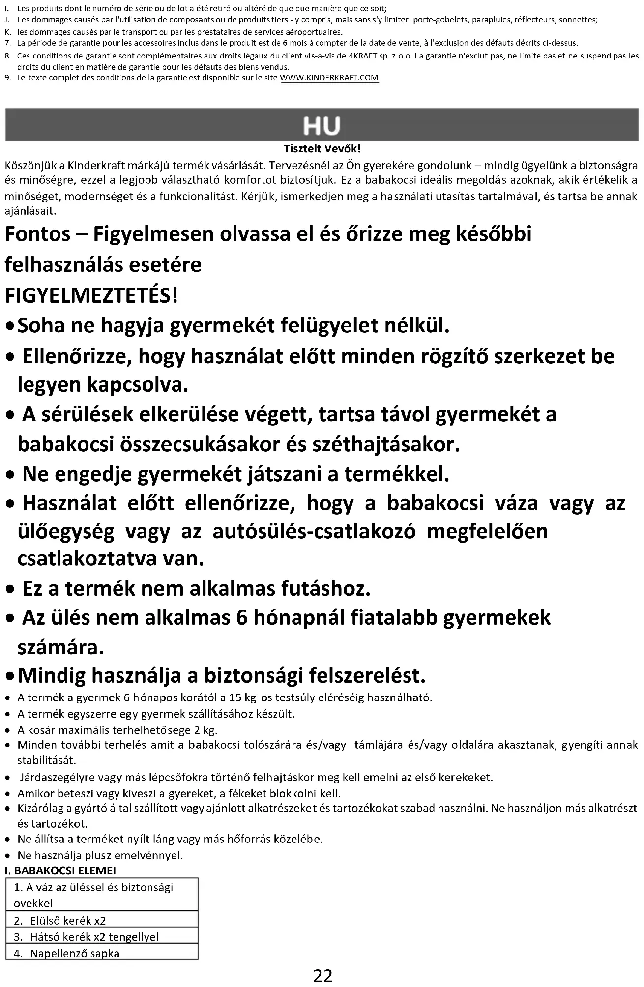 Tisztelt Vevők! Köszönjük a Kinderkraft márkájú termék vásárlását. Tervezésnél az Ön gyerekére gondolunk – mindig ügyelünk a biztonságra és minőségre, ezzel a legjobb választható komfortot biztosítjuk. Ez a babakocsi ideális megoldás azoknak, akik értékelik a minőséget, modernséget és a funkcionalitást. Kérjük, ismerkedjen meg a használati utasítás tartalmával, és tartsa be annak ajánlásait. Fontos – Figyelmesen olvassa el és őrizze meg későbbi felhasználás esetére FIGYELMEZTETÉS!