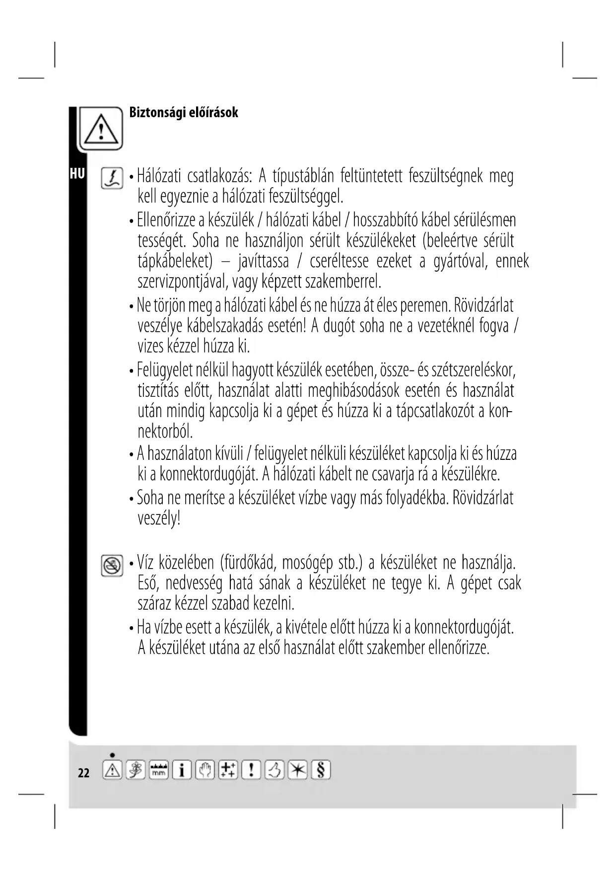 - Víz közelében (fürdőkád, mosógép stb.) a készüléket ne használja. Eső, nedvesség hatá sának a készüléket ne tegye ki. A gépet csak száraz kézzel szabad kezelni.23 Biztonsági előírások