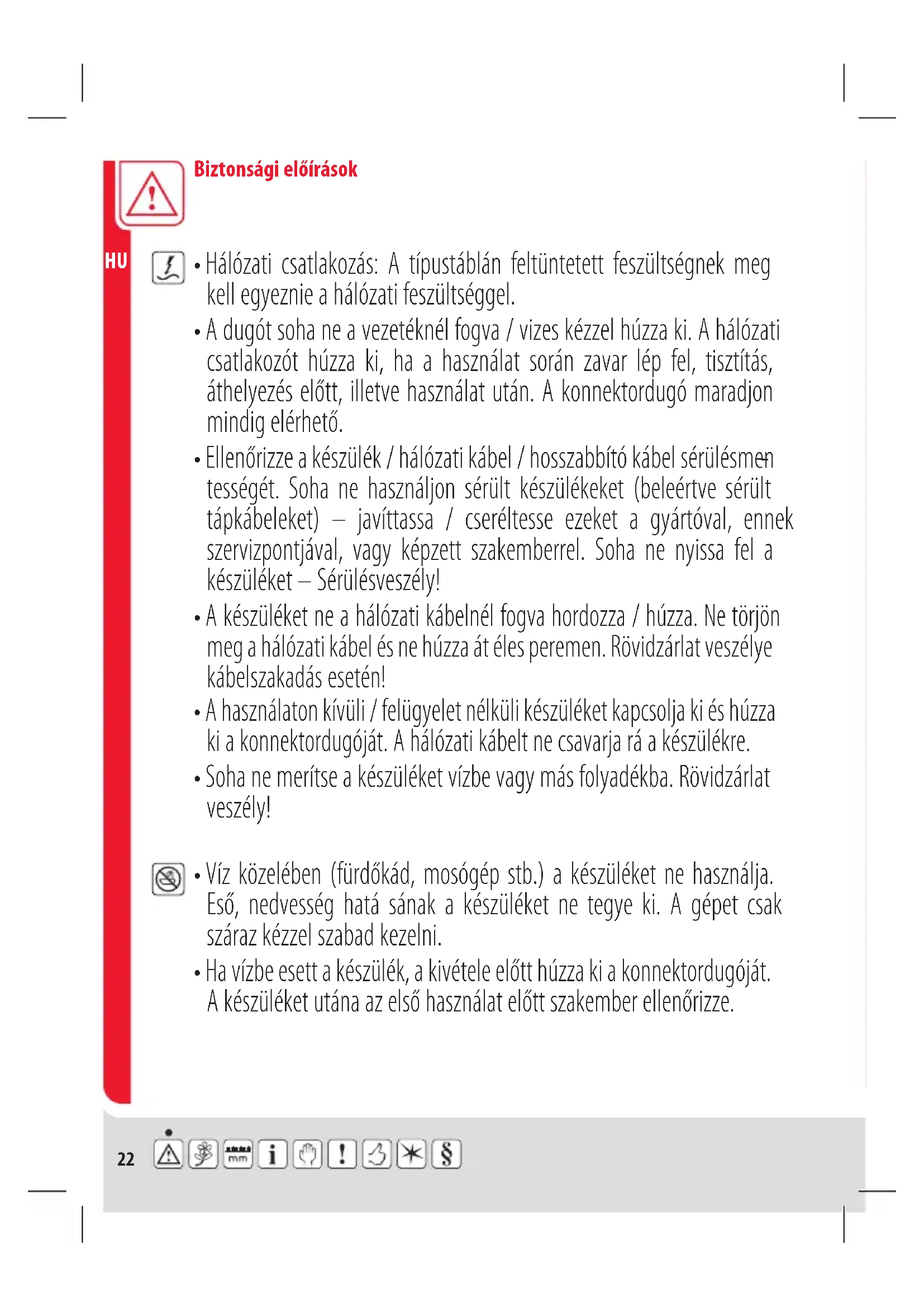 - Víz közelében (fürdőkád, mosógép stb.) a készüléket ne használja. Eső, nedvesség hatá sának a készüléket ne tegye ki. A gépet csak száraz kézzel szabad kezelni.23 Biztonsági előírások