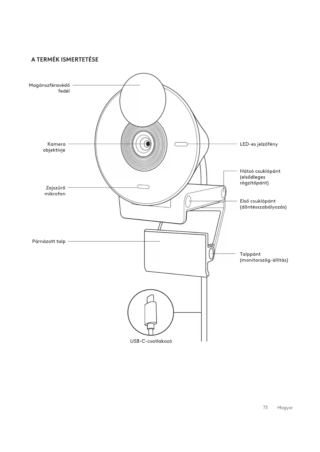 A Logi Tune a szover és a belső vezérlőprogram rendszeres frissítésével javítja awebkamera teljesítményét. Javasoljuk, hogy frissítse webkameráját, éshasználja ki a Brio 300 nagyszerű funkcióit. Ehhez töltse le a Logi Tune alkalmazást awww.logitech.com/tune weboldalról Logi Tune Webkamera: Magasság × szélesség × mélység: 65,63mm (2,58 hüvelyk) x 53,1mm (2,09 hüvelyk) x 45mm (1,78 hüvelyk) rögzítőcsipesszel A termék tömege: 74,6 g (2,63 uncia), rögzítőcsipesszel és kábellel együtt A csatlakoztatott kábel hossza: 1,5 m (5 láb) MÉRETEK 76Magyar© 2023 Logitech. A Logitech és a Logi név, valamint a Logitech embléma a Logitech EuropeS.A. vállalatnak, illetve leányvállalatainak a védjegye vagy bejegyzett védjegye az Amerikai Egyesült Államokban és más országokban. Az USB-C és minden egyéb védjegy az illető védjegy birtokosának tulajdona. A felhasználói útmutató esetleges hibáiért a Logitech nem vállal felelősséget. Az itt található információk előzetes értesítés nélkül változhatnak. www.logitech.com/support/Brio300POPIS PRODUKTU Indikátor LED Přední pant (nastavení sklonu) Pant základny (nastavení úhlu monitoru) Zadní pant (hlavní upevňovací pant) Krytka objektivu Objektiv kamery Mikrofon spotlačením šumu Polstrovaná základna Konektor USB-C 78 Česká verzeUSB-C OBSAH BALENÍ