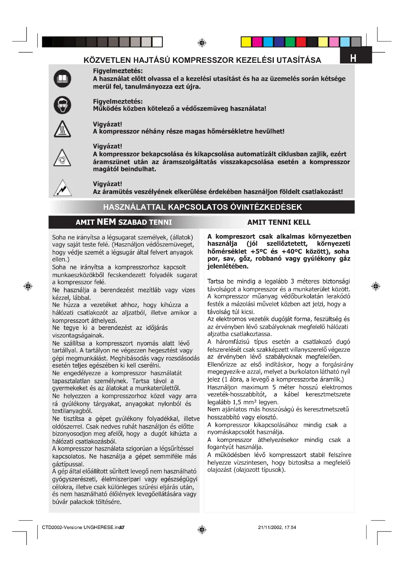 Soha ne irányítsa a légsugarat személyek, (állatok) vagy saját teste felé. (Használjon védőszemüveget, hogy védje szemét a légsugár által felvert anyagok ellen.)Soha ne irányítsa a kompresszorhoz kapcsolt munkaeszközökből fecskendezett folyadék sugarat a kompresszor felé.Ne használja a berendezést mezítláb vagy vizes kézzel, lábbal.Ne húzza a vezetéket ahhoz, hogy kihúzza a hálózati csatlakozót az aljzatból, illetve amikor a kompresszort áthelyezi.Ne tegye ki a berendezést az időjárás viszontagságainak.Ne szállítsa a kompresszort nyomás alatt lévő tartállyal. A tartályon ne végezzen hegesztést vagy gépi megmunkálást. Meghibásodás vagy rozsdásodás esetén teljes egészében ki kell cserélni.Ne engedélyezze a kompresszor használatát tapasztalatlan személynek. Tartsa távol a gyermekeket és az álatokat a munkaterülettől. Ne helyezzen a kompresszorhoz közel vagy arra rá gyúlékony tárgyakat, anyagokat nylonból és textilanyagból.Ne tisztítsa a gépet gyúlékony folyadékkal, illetve oldószerrel. Csak nedves ruhát használjon és előtte bizonyosodjon meg afelől, hogy a dugót kihúzta a hálózati csatlakozásból.A kompresszor használata szigorúan a légsűrítéssel kapcsolatos. Ne használja a gépet semmiféle más gáztípussal. A gép által előállított sűrített levegő nem használható gyógyszerészeti, élelmiszeripari vagy egészségügyi célokra, illetve csak különleges szűrési eljárás után, és nem használható élőlények levegőellátására vagy búvár palackok töltésére.Figyelmeztetés:A használat előtt olvassa el a kezelési utasítást és ha az üzemelés során kétsége merül fel, tanulmányozza ezt újra.Figyelmeztetés:Működés közben kötelező a védőszemüveg használata!Vigyázat!A kompresszor néhány része magas hőmérsékletre hevülhet!Vigyázat!A kompresszor bekapcsolása és kikapcsolása automatizált ciklusban zajlik, ezért áramszünet után az áramszolgáltatás visszakapcsolása esetén a kompresszor magától beindulhat.Vigyázat!Az áramütés veszélyének elkerülése érdekében használjon földelt csatlakozást!