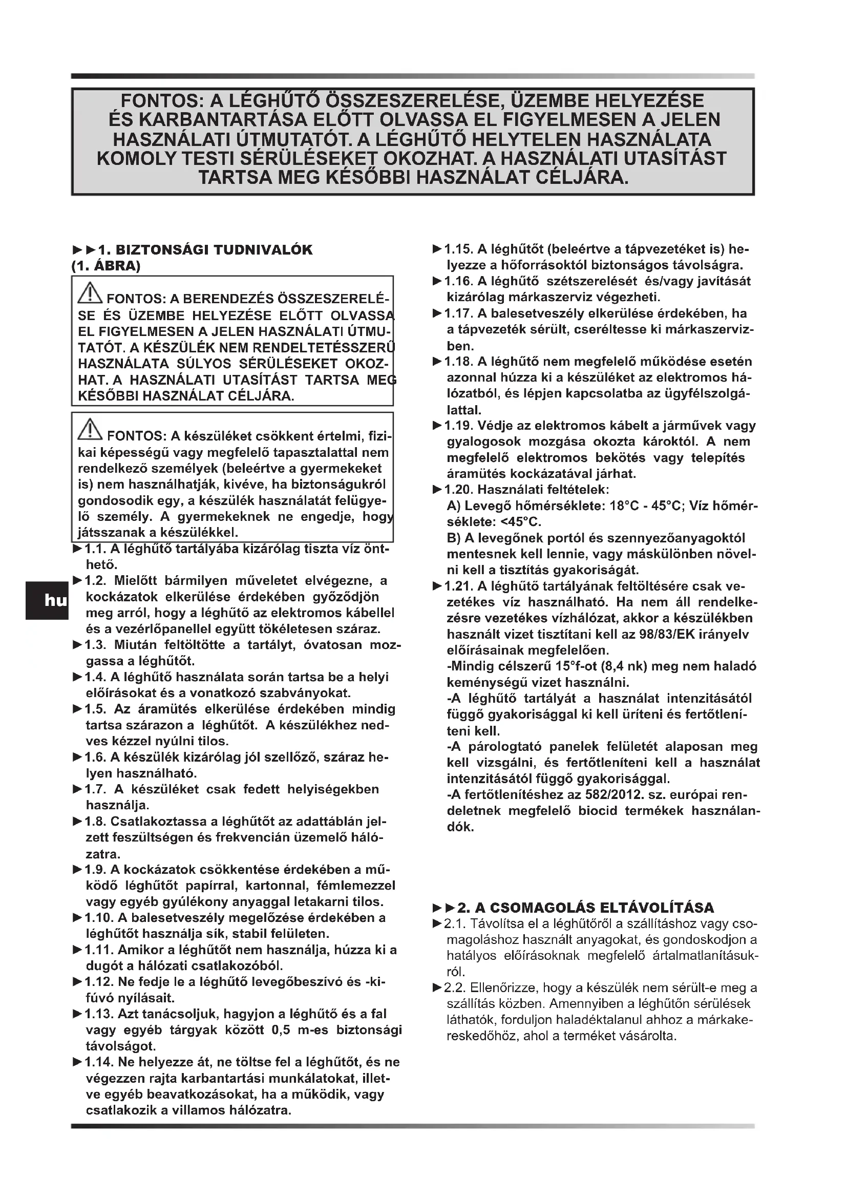 SE ÉS ÜZEMBE HELYEZÉSE ELŐTT OLVASSA EL FIGYELMESEN A JELEN HASZNÁLATI ÚTMU- TATÓT. A KÉSZÜLÉK NEM RENDELTETÉSSZERŰ HASZNÁLATA SÚLYOS SÉRÜLÉSEKET OKOZ- HAT. A HASZNÁLATI UTASÍTÁST TARTSA MEG KÉSŐBBI HASZNÁLAT CÉLJÁRA. FONTOS: A készüléket csökkent értelmi, zi- kai képességű vagy megfelelő tapasztalattal nem rendelkező személyek (beleértve a gyermekeket is) nem használhatják, kivéve, ha biztonságukról gondosodik egy, a készülék használatát felügye- lő személy. A gyermekeknek ne engedje, hogy játsszanak a készülékkel. ►1.1. A léghűtő tartályába kizárólag tiszta víz önt- hető. ►1.2. Mielőtt bármilyen műveletet elvégezne, a kockázatok elkerülése érdekében győződjön meg arról, hogy a léghűtő az elektromos kábellel és a vezérlőpanellel együtt tökéletesen száraz. ►1.3. Miután feltöltötte a tartályt, óvatosan moz- gassa a léghűtőt. ►1.4. A léghűtő használata során tartsa be a helyi előírásokat és a vonatkozó szabványokat. ►1.5. Az áramütés elkerülése érdekében mindig tartsa szárazon a léghűtőt. A készülékhez ned- ves kézzel nyúlni tilos. ►1.6. A készülék kizárólag jól szellőző, száraz he- lyen használható. ►1.7. A készüléket csak fedett helyiségekben használja. ►1.8. Csatlakoztassa a léghűtőt az adattáblán jel- zett feszültségen és frekvencián üzemelő háló- zatra. ►1.9. A kockázatok csökkentése érdekében a mű- ködő léghűtőt papírral, kartonnal, fémlemezzel vagy egyéb gyúlékony anyaggal letakarni tilos. ►1.10. A balesetveszély megelőzése érdekében a léghűtőt használja sík, stabil felületen. ►1.11. Amikor a léghűtőt nem használja, húzza ki a dugót a hálózati csatlakozóból. ►1.12. Ne fedje le a léghűtő levegőbeszívó és -ki- fúvó nyílásait. ►1.13. Azt tanácsoljuk, hagyjon a léghűtő és a fal vagy egyéb tárgyak között 0,5 m-es biztonsági távolságot. ►1.14. Ne helyezze át, ne töltse fel a léghűtőt, és ne végezzen rajta karbantartási munkálatokat, illet- ve egyéb beavatkozásokat, ha a működik, vagy csatlakozik a villamos hálózatra. ►1.15. A léghűtőt (beleértve a tápvezetéket is) he- lyezze a hőforrásoktól biztonságos távolságra. ►1.16. A léghűtő szétszerelését és/vagy javítását kizárólag márkaszerviz végezheti. ►1.17. A balesetveszély elkerülése érdekében, ha a tápvezeték sérült, cseréltesse ki márkaszerviz- ben. ►1.18. A léghűtő nem megfelelő működése esetén azonnal húzza ki a készüléket az elektromos há- lózatból, és lépjen kapcsolatba az ügyfélszolgá- lattal. ►1.19. Védje az elektromos kábelt a járművek vagy gyalogosok mozgása okozta károktól. A nem megfelelő elektromos bekötés vagy telepítés áramütés kockázatával járhat. ►1.20. Használati feltételek: A) Levegő hőmérséklete: 18°C - 45°C; Víz hőmér- séklete: <45°C. B) A levegőnek portól és szennyezőanyagoktól mentesnek kell lennie, vagy máskülönben növel- ni kell a tisztítás gyakoriságát. ►1.21. A léghűtő tartályának feltöltésére csak ve- zetékes víz használható. Ha nem áll rendelke- zésre vezetékes vízhálózat, akkor a készülékben használt vizet tisztítani kell az 98/83/EK irányelv előírásainak megfelelően. -Mindig célszerű 15°f-ot (8,4 nk) meg nem haladó keménységű vizet használni. -A léghűtő tartályát a használat intenzitásától függő gyakorisággal ki kell üríteni és fertőtlení- teni kell. -A párologtató panelek felületét alaposan meg kell vizsgálni, és fertőtleníteni kell a használat intenzitásától függő gyakorisággal. -A fertőtlenítéshez az 582/2012. sz. európai ren- deletnek megfelelő biocid termékek használan- dók. ►►2. A CSOMAGOLÁS ELTÁVOLÍTÁSA ►2.1. Távolítsa el a léghűtőről a szállításhoz vagy cso- magoláshoz használt anyagokat, és gondoskodjon a hatályos előírásoknak megfelelő ártalmatlanításuk- ról. ►2.2. Ellenőrizze, hogy a készülék nem sérült-e meg a szállítás közben. Amennyiben a léghűtőn sérülések láthatók, forduljon haladéktalanul ahhoz a márkake- reskedőhöz, ahol a terméket vásárolta. FONTOS: A LÉGHŰTŐ ÖSSZESZERELÉSE, ÜZEMBE HELYEZÉSE ÉS KARBANTARTÁSA ELŐTT OLVASSA EL FIGYELMESEN A JELEN HASZNÁLATI ÚTMUTATÓT. A LÉGHŰTŐ HELYTELEN HASZNÁLATA KOMOLY TESTI SÉRÜLÉSEKET OKOZHAT. A HASZNÁLATI UTASÍTÁST TARTSA MEG KÉSŐBBI HASZNÁLAT CÉLJÁRA.hu