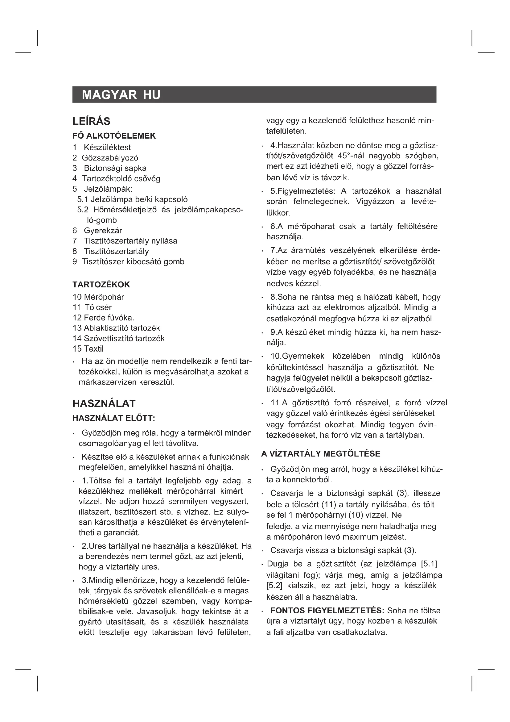 - 10.Gyermekek közelében mindig különös körültekintéssel használja a gőztisztítót. Ne hagyja felügyelet nélkül a bekapcsolt gőztisz- títót/szövetgőzölőt.
