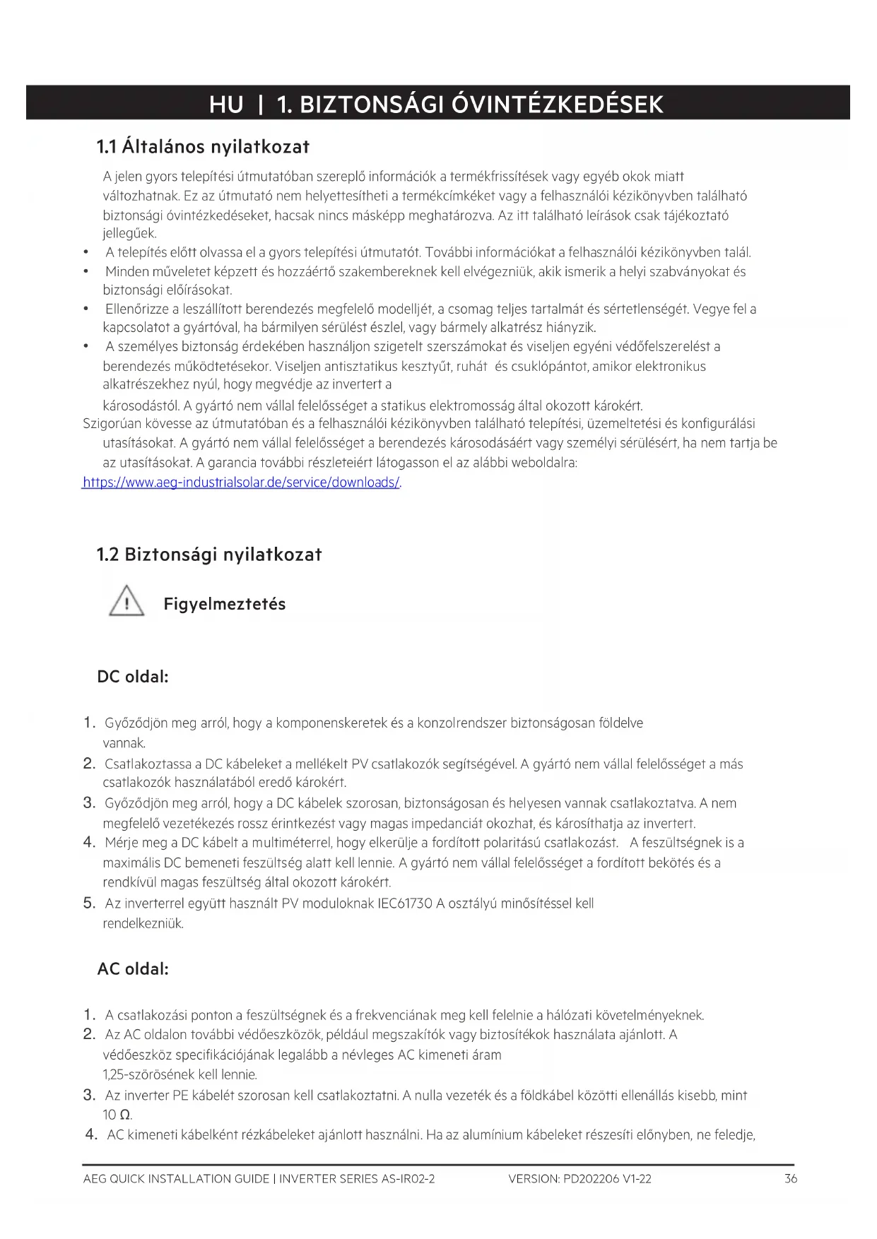 - A személyes biztonság érdekében használjon szigetelt szerszámokat és viseljen egyéni védőfelszerelést a berendezés működtetésekor. Viseljen antisztatikus kesztyűt, ruhát és csuklópántot, amikor elektronikus alkatrészekhez nyúl, hogy megvédje az invertert a károsodástól. A gyártó nem vállal felelősséget a statikus elektromosság által okozott károkért. Szigorúan kövesse az útmutatóban és a felhasználói kézikönyvben található telepítési, üzemeltetési és konfigurálási utasításokat. A gyártó nem vállal felelősséget a berendezés károsodásáért vagy személyi sérülésért, ha nem tartja be az utasításokat. A garancia további részleteiért látogasson el az alábbi weboldalra: https://www.aeg-industrialsolar.de/service/downloads/.