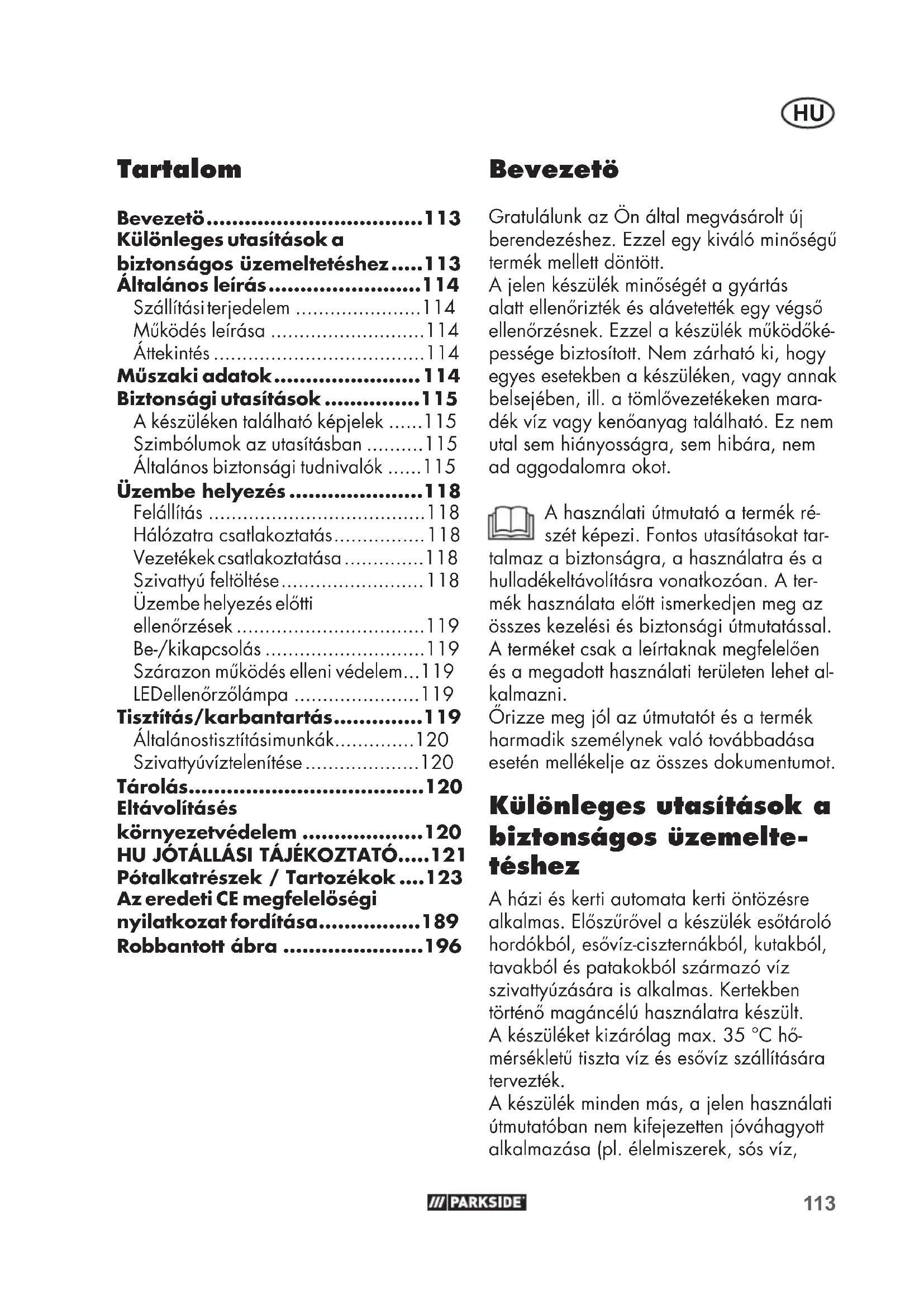 - Bevezetö Gratulálunk az Ön által megvásárolt új berendezéshez. Ezzel egy kiváló minőségű termék mellett döntött. A jelen készülék minőségét a gyártás alatt ellenőrizték és alávetették egy végső ellenőrzésnek. Ezzel a készülék működőké- pessége biztosított. Nem zárható ki, hogy egyes esetekben a készüléken, vagy annak belsejében, ill. a tömlővezetékeken mara- dék víz vagy kenőanyag található. Ez nem utal sem hiányosságra, sem hibára, nem ad aggodalomra okot. A használati útmutató a termék ré- szét képezi. Fontos utasításokat tar- talmaz a biztonságra, a használatra és a hulladékeltávolításra vonatkozóan. A ter- mék használata előtt ismerkedjen meg az összes kezelési és biztonsági útmutatással. A terméket csak a leírtaknak megfelelően és a megadott használati területen lehet al- kalmazni. Őrizze meg jól az útmutatót és a termék harmadik személynek való továbbadása esetén mellékelje az összes dokumentumot. Különleges utasítások a biztonságos üzemelte- téshez A házi és kerti automata kerti öntözésre alkalmas. Előszűrővel a készülék esőtároló hordókból, esővíz-ciszternákból, kutakból, tavakból és patakokból származó víz szivattyúzására is alkalmas. Kertekben történő magáncélú használatra készült. A készüléket kizárólag max. 35 °C hő- mérsékletű tiszta víz és esővíz szállítására tervezték. A készülék minden más, a jelen használati útmutatóban nem kifejezetten jóváhagyott alkalmazása (pl. élelmiszerek, sós víz, Tartalom Bevezetö p. 113