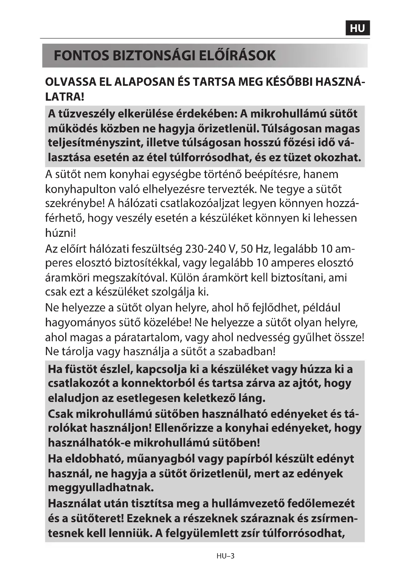 OLVASSA EL ALAPOSAN ÉS TARTSA MEG KÉSŐBBI HASZNÁ- LATRA! A tűzveszély elkerülése érdekében: A mikrohullámú sütőt működés közben ne hagyja őrizetlenül. Túlságosan magas teljesítményszint, illetve túlságosan hosszú főzési idő vá- lasztása esetén az étel túlforrósodhat, és ez tüzet okozhat. A sütőt nem konyhai egységbe történő beépítésre, hanem konyhapulton való elhelyezésre tervezték. Ne tegye a sütőt szekrénybe! A hálózati csatlakozóaljzat legyen könnyen hozzá- férhető, hogy veszély esetén a készüléket könnyen ki lehessen húzni! Az előírt hálózati feszültség 230-240 V, 50 Hz, legalább 10am- peres elosztó biztosítékkal, vagy legalább 10 amperes elosztó áramköri megszakítóval. Külön áramkört kell biztosítani, ami csak ezt a készüléket szolgálja ki. Ne helyezze a sütőt olyan helyre, ahol hő fejlődhet, például hagyományos sütő közelébe! Ne helyezze a sütőt olyan helyre, ahol magas a páratartalom, vagy ahol nedvesség gyűlhet össze! Ne tárolja vagy használja a sütőt a szabadban! Ha füstöt észlel, kapcsolja ki a készüléket vagy húzza ki a csatlakozót a konnektorból és tartsa zárva az ajtót, hogy elaludjon az esetlegesen keletkező láng. Csak mikrohullámú sütőben használható edényeket és tá- rolókat használjon! Ellenőrizze a konyhai edényeket, hogy használhatók-e mikrohullámú sütőben! Ha eldobható, műanyagból vagy papírból készült edényt használ, ne hagyja a sütőt őrizetlenül, mert az edények meggyulladhatnak. Használat után tisztítsa meg a hullámvezető fedőlemezét és a sütőteret! Ezeknek a részeknek száraznak és zsírmen- tesnek kell lenniük. A felgyülemlett zsír túlforrósodhat,HU–4 HU–4 füstölhet és lángra kaphat. Tartsa távol a gyúlékony anyagokat a sütőtől és a szellőzőnyílá- soktól. Ne takarja le a szellőzőnyílásokat! Távolítsa el az összes fém zárófóliát, drótot stb. az ételről és az étel csomagolásáról. A fémes felületeken képződő szikra tüzet okozhat. Ne használja a mikrohullámú sütőt olaj melegítésére, illetve olajjal történő sütésre. A hőmérsékletet nem lehet szabályozni, és az olaj lángra lobbanhat. Pattogatott kukorica készítéséhez kizárólag mikrohullámú sütő- höz való pattogatott kukorica készítő edényt használjon. Ne tároljon ételt vagy bármi mást a sütő belsejében. A sütő beindítása után ellenőrizze annak beállításait. Így meg- bizonyosodhat arról, hogy a sütő a kívánt módon működik-e. Működés közben ne hagyja felügyelet nélkül a sütőt. Fokozatos elővigyázatosságra van szükség a magas cukor- vagy zsírtartalmú ételek (például kolbász, sütemények, karácsonyi puding) készítése vagy melegítése esetén, a túlmelegedés és tűz keletkezésének elkerülése érdekében. További tanácsokat a használati útmutatóban talál. Sérülés kockázatának elkerülése. FIGYELMEZTETÉS: Ne használja a sütőt, ha sérült, vagy ha hibásan működik. Használat előtt ellenőrizze az alábbiakat: a) Ellenőrizze, hogy az ajtó megfelelően záródik-e, hogy egyenesen áll-e, és hogy nincs-e meggörbülve. b) Ellenőrizze, hogy a zsanérok és az ajtó biztonsági reteszei nincsenek-e eltörve vagy meglazulva. c) Győződjön meg róla, hogy az ajtótömítések és felfekvő felületeik nincsenek megsérülve. d) Ellenőrizze, hogy a sütőtérben, illetve az ajtón nincsenek-e horpadások. e) Győződjön meg róla, hogy a hálózati kábel és a csatlakozó- dugasz nincs megsérülve. HU–5HU HU–4 HU–5 HU–5 Ha az ajtó vagy annak tömítése megsérült, ne működtesse a sütőt mindaddig, amíg szakember el nem végzi ezek javítását! Tilos a sütőt a felhasználónak magának módosítania, illet- ve javítania! Szakemberen kívül bárki más számára veszé- lyes bármely olyan szervizelést, vagy javítást eszközölni, amely a mikrohullámú sugárzás ellen védő fedél levételé- vel jár! Ne működtesse a sütőt nyitott ajtóval, és ne végezzen semmi- lyen átalakítást az ajtó biztonsági reteszein. Ne működtesse a sütőt, ha az ajtótömítések és felfekvő felületeik közé bármilyen tárgy került. Ne hagyja, hogy zsír vagy szennyeződés gyűljön fel az ajtótömítéseken és a kapcsolódó alkatrészeken. Tisztítsa meg a sütőt rendszeres időközönként és távolítson el min- den ételmaradékot. Tartsa be az "Ápolás és tisztítás" rész utasításait. Ügyeljen a sütő tisztán tartására! Ellenkező esetben a sütő felülete könnyen megrongálódhat, ami lerövidítheti a készülék élettartamát, és balesetet okozhat. Szívritmusszabályzóval élő személyek kérjék ki orvosuk vagy a készülék gyártójának tanácsát a mikrohullámú sütővel kapcso- latos óvintézkedésekről. Áramütés kockázatának kiküszöbölése