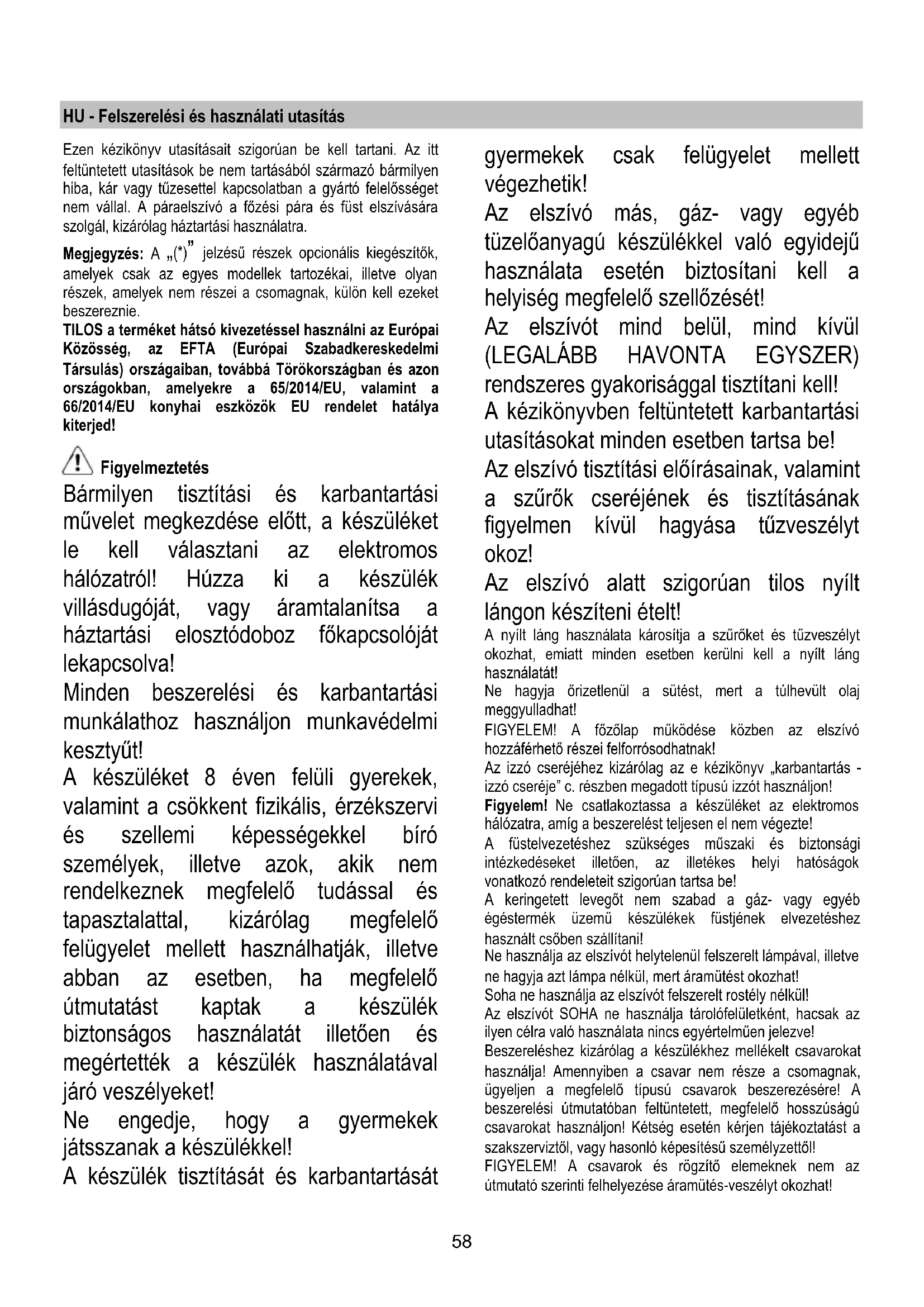 покритието на защитната решетка на мотора, като се внимава обозначението Х1 или Х2 или Х3 върху въгленовия филтър да отговаря на обозначението Y1 или Y2 върху отвеждащото устройство, след това да се завърти в посока на часовниковата стрелка; при демонтиране, да се завърти в посока, обратна на часовниковата стрелка , ако има езиче Z, то трябва първо да се повдигне леко. Подмяна на ел. крушки Изключете уреда от ел. мрежата. Внимание! Преди да вземете в ръка ел. крушките проверете дали са изстинали. Подменете повредената лампа с нова от същия тип, така както е посочено върху етикета с характеристиките или близо до самата лампа върху аспиратора.57 Подмяна на лампи 28W – Да се свали повредената лампа и да се смени с халогенна овална лампа с ел.крушка мах 28W E14. Да се свали решетката, за да се има достъп до мястото на лампите. Подмяна на халогенна лампа – Да се стигне до нея – да се свали защитата, като се повдига с малка режеща отверка или друг подобен уред. Да се смени повредената лампа. Да се използват само халогенни лампи 20W max (G4), като се внимава да не се пипат с ръце. Да се затвори отново плафониерата (да щракне). Ако ел. крушките не светят, проверете дали са монтирани правилно преди да потърсите помощта на специалист.58 HU - Felszerelési és használati utasítás Ezen kézikönyv utasításait szigorúan be kell tartani. Az itt feltüntetett utasítások be nem tartásából származó bármilyen hiba, kár vagy tűzesettel kapcsolatban a gyártó felelősséget nem vállal. A páraelszívó a főzési pára és füst elszívására szolgál, kizárólag háztartási használatra. Megjegyzés: A „(*)” jelzésű részek opcionális kiegészítők, amelyek csak az egyes modellek tartozékai, illetve olyan részek, amelyek nem részei a csomagnak, külön kell ezeket beszereznie. TILOS a terméket hátsó kivezetéssel használni az Európai Közösség, az EFTA (Európai Szabadkereskedelmi Társulás) országaiban, továbbá Törökországban és azon országokban, amelyekre a 65/2014/EU, valamint a 66/2014/EU konyhai eszközök EU rendelet hatálya kiterjed! Figyelmeztetés Bármilyen tisztítási és karbantartási művelet megkezdése előtt, a készüléket le kell választani az elektromos hálózatról! Húzza ki a készülék villásdugóját, vagy áramtalanítsa a háztartási elosztódoboz főkapcsolóját lekapcsolva! Minden beszerelési és karbantartási munkálathoz használjon munkavédelmi kesztyűt! A készüléket 8 éven felüli gyerekek, valamint a csökkent fizikális, érzékszervi és szellemi képességekkel bíró személyek, illetve azok, akik nem rendelkeznek megfelelő tudással és tapasztalattal, kizárólag megfelelő felügyelet mellett használhatják, illetve abban az esetben, ha megfelelő útmutatást kaptak a készülék biztonságos használatát illetően és megértették a készülék használatával járó veszélyeket! Ne engedje, hogy a gyermekek játsszanak a készülékkel! A készülék tisztítását és karbantartását gyermekek csak felügyelet mellett végezhetik! Az elszívó más, gáz- vagy egyéb tüzelőanyagú készülékkel való egyidejű használata esetén biztosítani kell a helyiség megfelelő szellőzését! Az elszívót mind belül, mind kívül (LEGALÁBB HAVONTA EGYSZER) rendszeres gyakorisággal tisztítani kell! A kézikönyvben feltüntetett karbantartási utasításokat minden esetben tartsa be! Az elszívó tisztítási előírásainak, valamint a szűrők cseréjének és tisztításának figyelmen kívül hagyása tűzveszélyt okoz! Az elszívó alatt szigorúan tilos nyílt lángon készíteni ételt! A nyílt láng használata károsítja a szűrőket és tűzveszélyt okozhat, emiatt minden esetben kerülni kell a nyílt láng használatát! Ne hagyja őrizetlenül a sütést, mert a túlhevült olaj meggyulladhat! FIGYELEM! A főzőlap működése közben az elszívó hozzáférhető részei felforrósodhatnak! Az izzó cseréjéhez kizárólag az e kézikönyv „karbantartás - izzó cseréje” c. részben megadott típusú izzót használjon! Figyelem! Ne csatlakoztassa a készüléket az elektromos hálózatra, amíg a beszerelést teljesen el nem végezte! A füstelvezetéshez szükséges műszaki és biztonsági intézkedéseket illetően, az illetékes helyi hatóságok vonatkozó rendeleteit szigorúan tartsa be! A keringetett levegőt nem szabad a gáz- vagy egyéb égéstermék üzemű készülékek füstjének elvezetéshez használt csőben szállítani! Ne használja az elszívót helytelenül felszerelt lámpával, illetve ne hagyja azt lámpa nélkül, mert áramütést okozhat! Soha ne használja az elszívót felszerelt rostély nélkül! Az elszívót SOHA ne használja tárolófelületként, hacsak az ilyen célra való használata nincs egyértelműen jelezve! Beszereléshez kizárólag a készülékhez mellékelt csavarokat használja! Amennyiben a csavar nem része a csomagnak, ügyeljen a megfelelő típusú csavarok