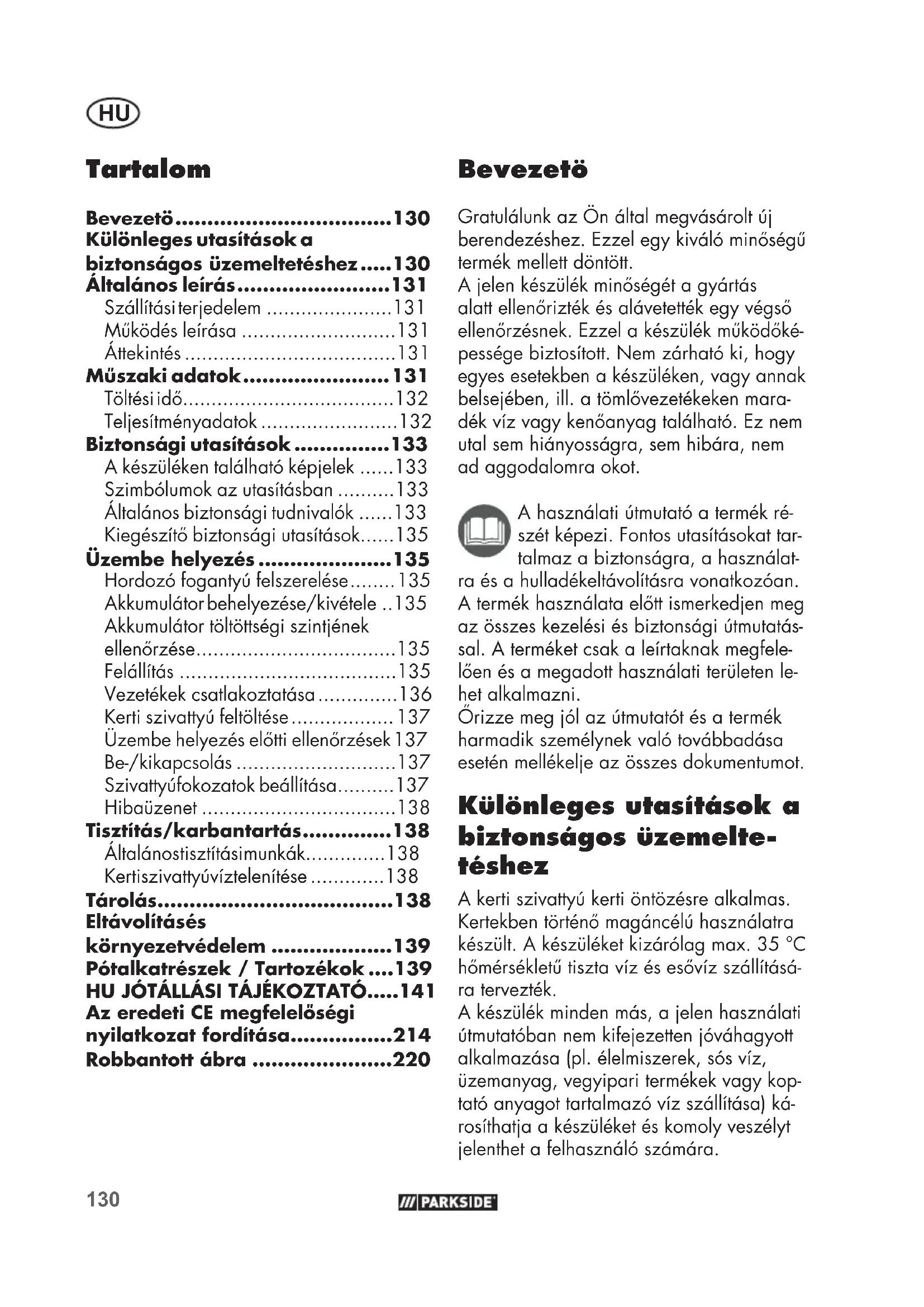 - Bevezetö Gratulálunk az Ön által megvásárolt új berendezéshez. Ezzel egy kiváló minőségű termék mellett döntött. A jelen készülék minőségét a gyártás alatt ellenőrizték és alávetették egy végső ellenőrzésnek. Ezzel a készülék működőké- pessége biztosított. Nem zárható ki, hogy egyes esetekben a készüléken, vagy annak belsejében, ill. a tömlővezetékeken mara- dék víz vagy kenőanyag található. Ez nem utal sem hiányosságra, sem hibára, nem ad aggodalomra okot. A használati útmutató a termék ré- szét képezi. Fontos utasításokat tar- talmaz a biztonságra, a használat- ra és a hulladékeltávolításra vonatkozóan. A termék használata előtt ismerkedjen meg az összes kezelési és biztonsági útmutatás- sal. A terméket csak a leírtaknak megfele- lően és a megadott használati területen le- het alkalmazni. Őrizze meg jól az útmutatót és a termék harmadik személynek való továbbadása esetén mellékelje az összes dokumentumot. Különleges utasítások a biztonságos üzemelte- téshez A kerti szivattyú kerti öntözésre alkalmas. Kertekben történő magáncélú használatra készült. A készüléket kizárólag max. 35 °C hőmérsékletű tiszta víz és esővíz szállításá- ra tervezték. A készülék minden más, a jelen használati útmutatóban nem kifejezetten jóváhagyott alkalmazása (pl. élelmiszerek, sós víz, üzemanyag, vegyipari termékek vagy kop- tató anyagot tartalmazó víz szállítása) ká- rosíthatja a készüléket és komoly veszélyt jelenthet a felhasználó számára. Tartalom Bevezetö p. 130