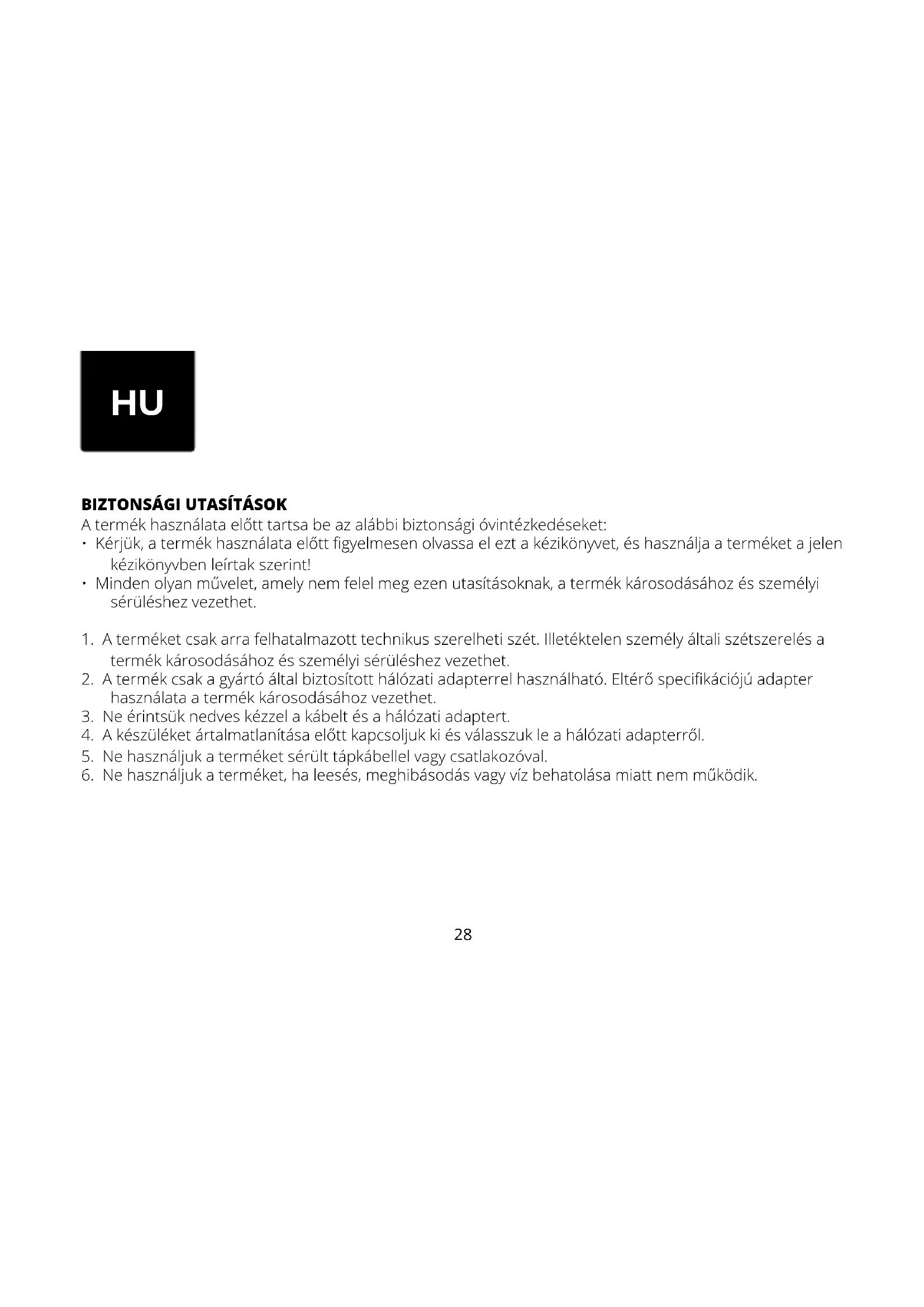 6. Ne használjuk a terméket, ha leesés, meghibásodás vagy víz behatolása miatt nem működik.