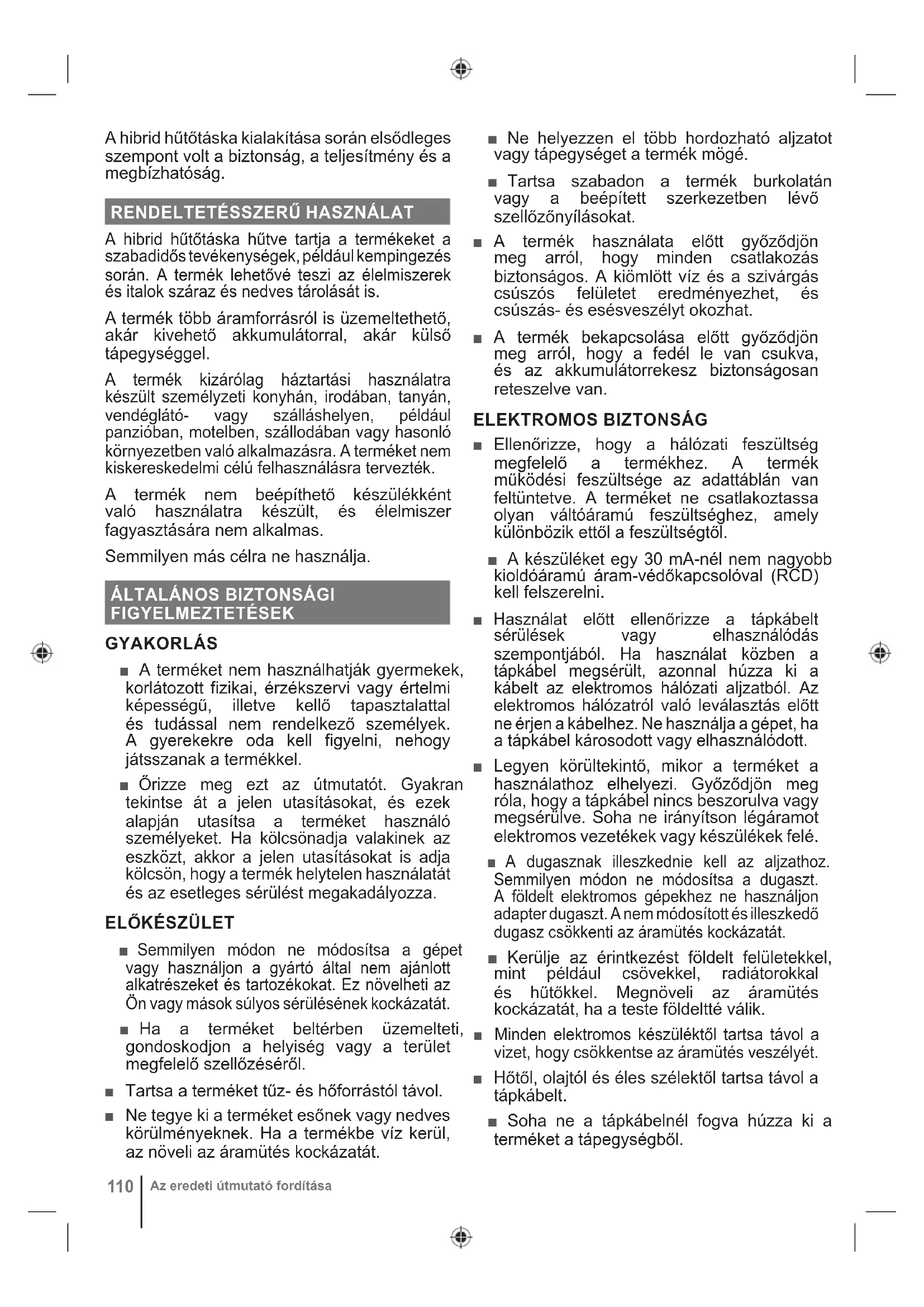 A hibrid hűtőtáska hűtve tartja a termékeket a szabadidős tevékenységek, például kempingezés során. A termék lehetővé teszi az élelmiszerek és italok száraz és nedves tárolását is. A termék több áramforrásról is üzemeltethető, akár kivehető akkumulátorral, akár külső tápegységgel. A termék kizárólag háztartási használatra készült személyzeti konyhán, irodában, tanyán, vendéglátó- vagy szálláshelyen, például panzióban, motelben, szállodában vagy hasonló környezetben való alkalmazásra. A terméket nem kiskereskedelmi célú felhasználásra tervezték. A termék nem beépíthető készülékként való használatra készült, és élelmiszer fagyasztására nem alkalmas. Semmilyen más célra ne használja.