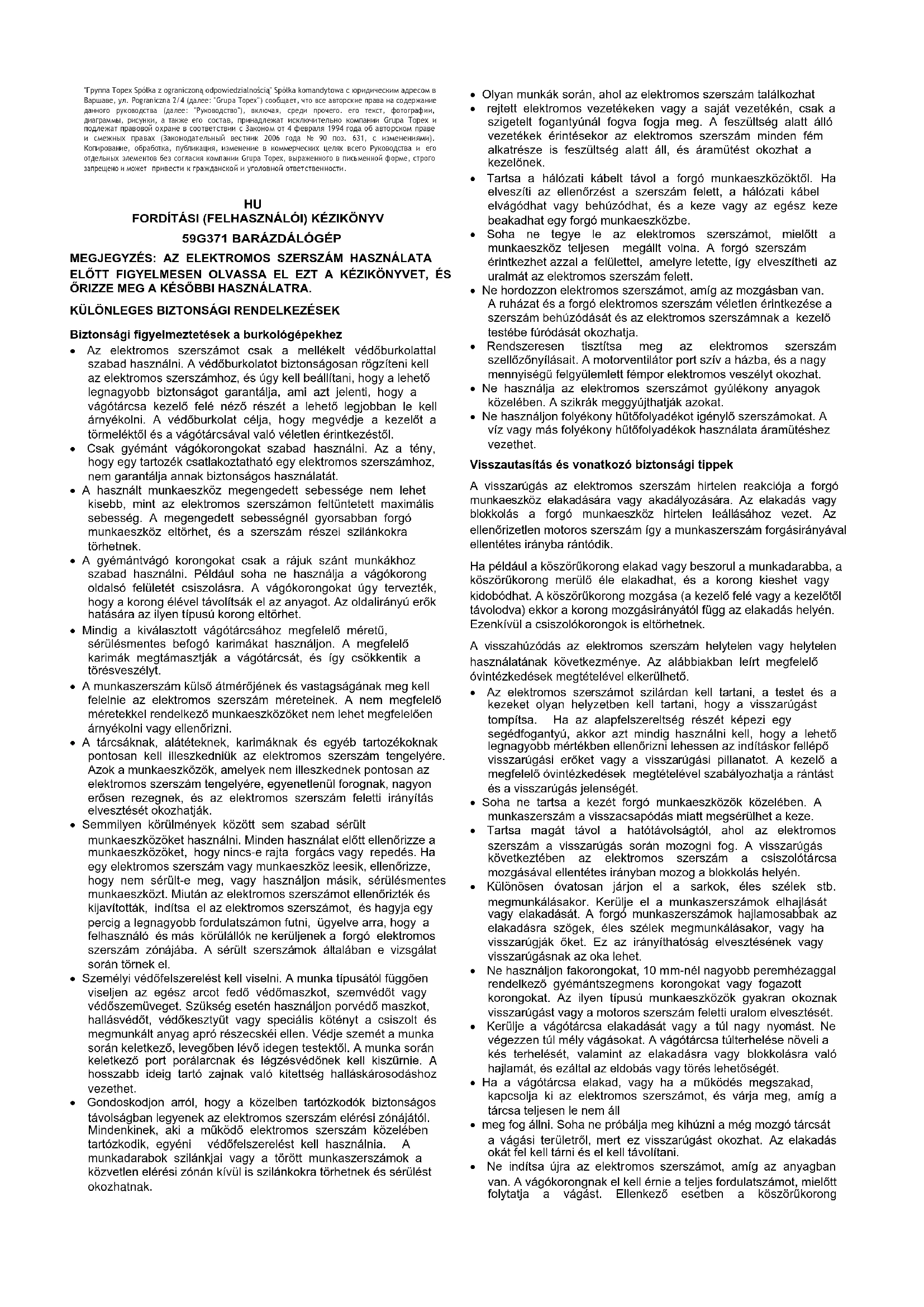 "Grupa Topex Spółka z ograniczoną odpowiedzialnością" Spółka komandytowa, székhelye Varsó, ul. Pograniczna 2/4 (a továbbiakban: "Grupa Topex") tájékoztat, hogy a jelen kézikönyv (a továbbiakban: "kézikönyv") tartalmának valamennyi szerzői joga, beleértve többek között. A kézikönyv szövege, fényképei, ábrái, rajzai, valamint a kézikönyv összetétele kizárólag a Grupa Topex tulajdonát képezik, és a szerzői és szomszédos jogokról szóló, 1994. február 4-i törvény (a 2006. évi 90. sz. Poz. 631. sz. törvénycikk, módosított változat) értelmében jogi védelem alatt állnak. A teljes kézikönyv és annak egyes elemeinek másolása, feldolgozása, közzététele, kereskedelmi célú módosítása a Grupa Topex írásban kifejezett hozzájárulása nélkül szigorúan tilos, és polgári és büntetőjogi felelősségre vonást vonhat maga után.