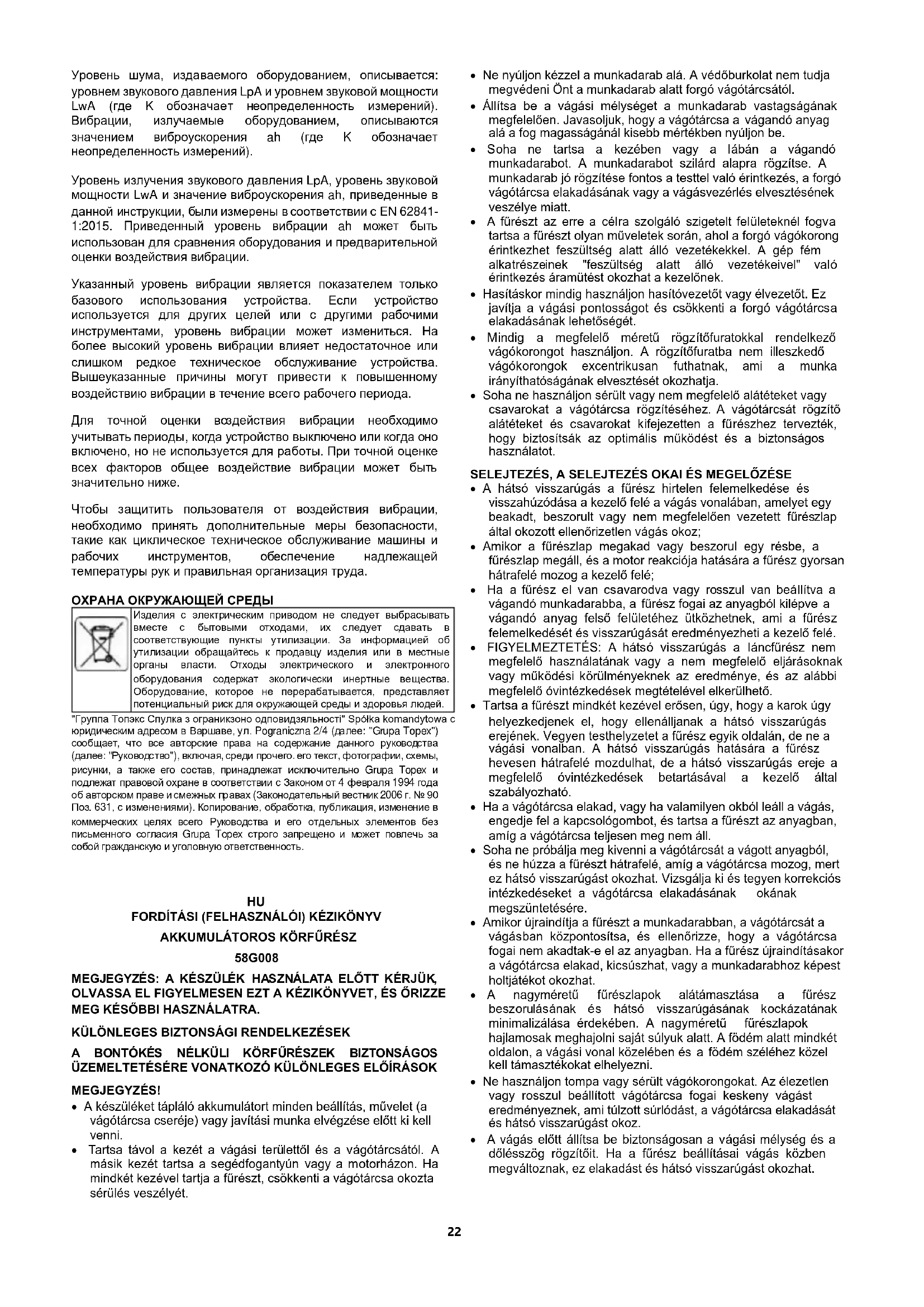 A zajjal és rezgéssel kapcsolatos információk A berendezés zajkibocsátási szintjét a következőkkel írják le: a kibocsátott hangnyomásszint LpA és a hangteljesítményszint LwA (ahol K a mérési bizonytalanságot jelöli). A berendezés által kibocsátott rezgéseket az ah rezgésgyorsulási érték írja le (ahol K a mérési bizonytalanságot jelöli). A jelen útmutatóban megadott LpA hangnyomás-kibocsátási szintet, LwA hangteljesítményszintet és ah rezgésgyorsulási értéket az EN 62841-1:2015 szabvány szerint mértük. A megadott ah rezgésszint a berendezések összehasonlítására és a rezgésexpozíció előzetes értékelésére használható. A megadott rezgésszint csak a készülék alapvető használatára jellemző. Ha a készüléket más alkalmazásokhoz vagy más munkaeszközökkel együtt használják, a rezgésszint változhat. A magasabb rezgésszintet az egység elégtelen vagy túl ritkán végzett26 karbantartása befolyásolja. A fent említett okok a teljes munkaidő alatt megnövekedett rezgéskitettséget eredményezhetnek. A rezgésexpozíció pontos becsléséhez figyelembe kell venni azokat az időszakokat, amikor a készülék ki van kapcsolva, vagy amikor be van kapcsolva, de nem használják munkára. Ha minden tényezőt pontosan becsülünk meg, a teljes rezgésexpozíció jelentősen alacsonyabb lehet. A vibráció hatásaitól való védelem érdekében további biztonsági intézkedéseket kell bevezetni, mint például a gép és a munkaeszközök ciklikus karbantartása, a megfelelő kézhőmérséklet biztosítása és a megfelelő munkaszervezés.